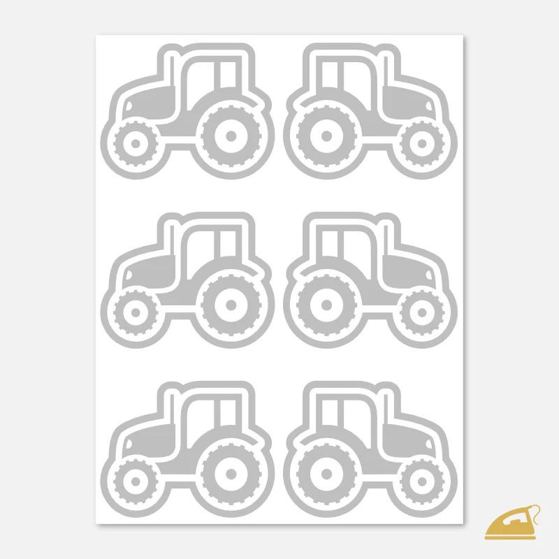 Reflexní nažehlovačky s malými traktory na archu 9×12 cm. Praktický detail pro dětské oblečení kluků se zálibou v traktorech a technice.