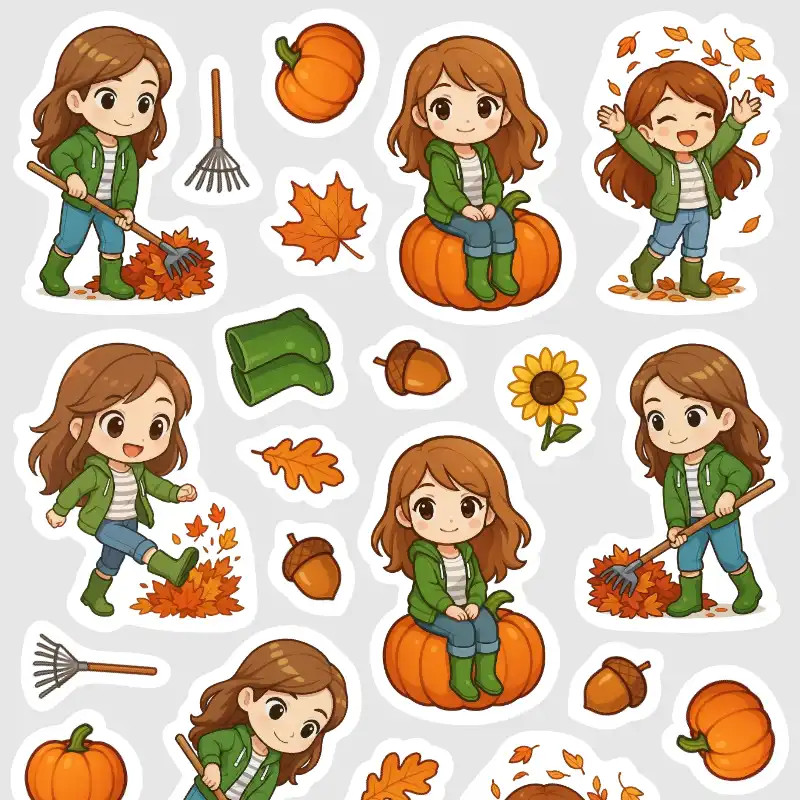 Mini aršík se samolepkami, kde Brunetka prožívá kouzlo podzimu – hrabání listí, dýně i radostné chvíle. Ideální pro ozdobení každého diáře.