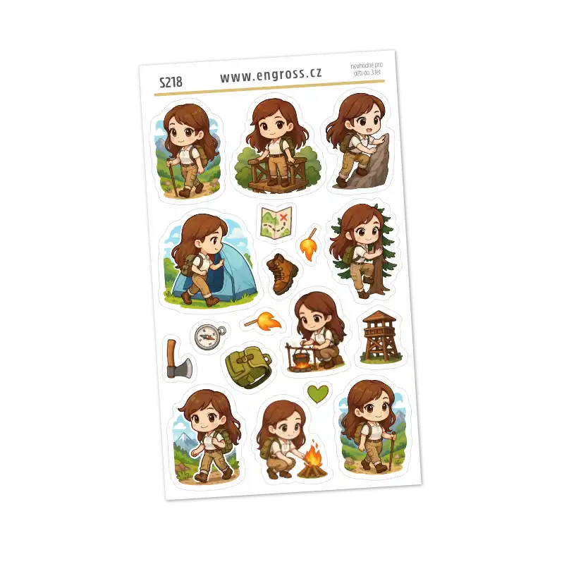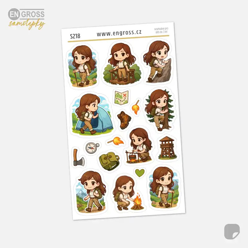 Sada 17 miniaturních samolepek pro označení aktivit spojených s turistikou a životem v přírodě. Aršík obsahuje 9 ilustrací postavičky brunetky při různých činnostech (lezení, vaření u ohně, výhledy) a 8 symbolů jako je kompas, sekera nebo rozhledna. Ideální pro přehledné a hravé plánování v jakémkoli formátu diáře.