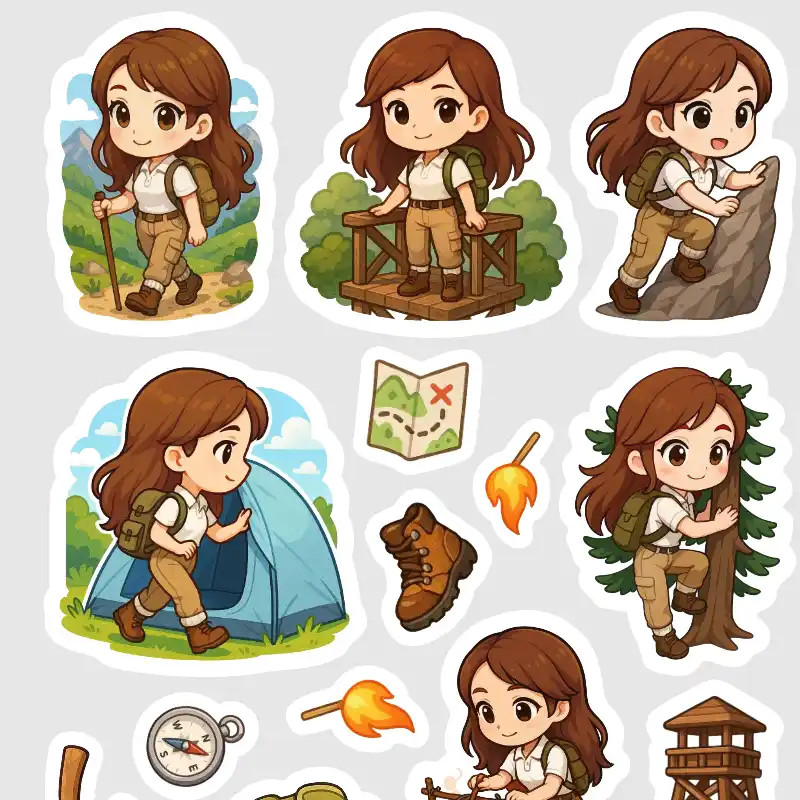 Brunetka v akci: 9 nálepek postavičky zachycené při výstupu na skálu, na vyhlídce, opékání dobrot, nebo prostě jen při radostném kráčení s krosnou.