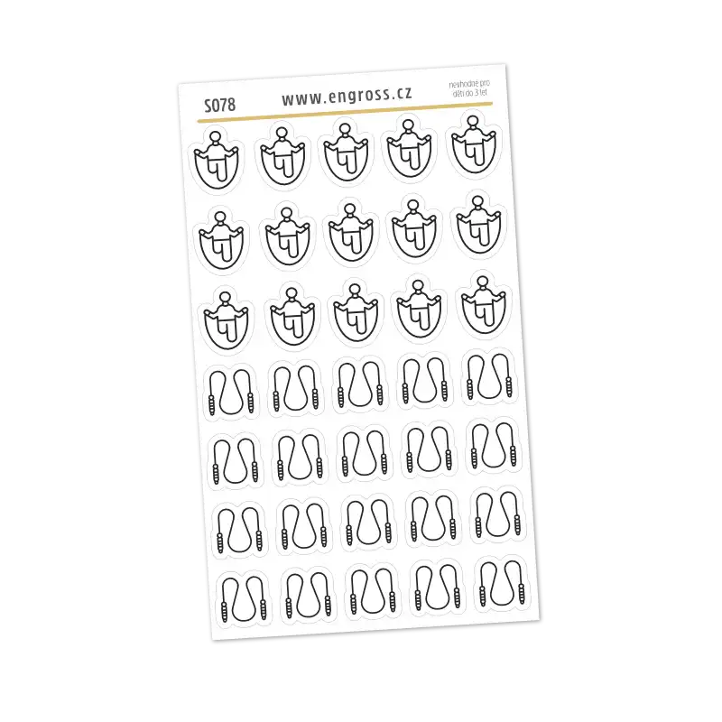 Sada 35 drobných černobílých samolepek s motivy švihadla a skákající postavičky. Ideální pomocník pro zaznamenávání kardio tréninků, sportovních výzev nebo pravidelných lekcí skipingu.