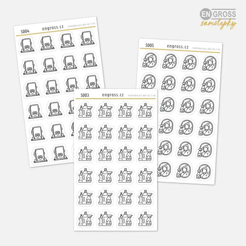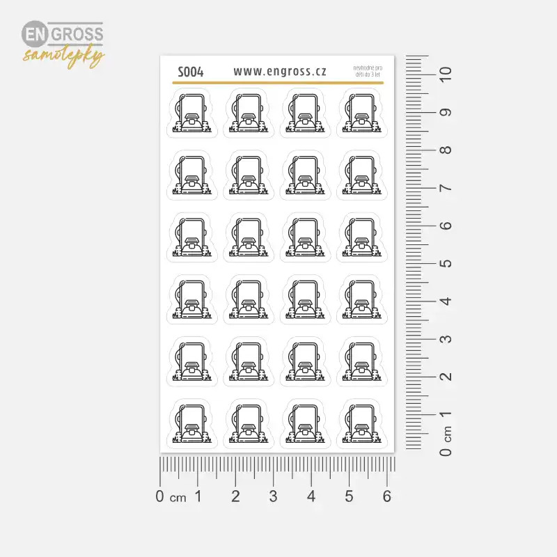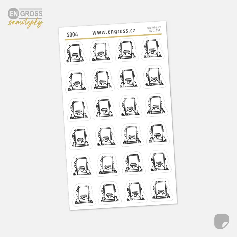 Sada 24 drobných černobílých samolepek s ikonou sekačky. Praktický pomocník pro plánování pravidelné údržby trávníku, který díky svému univerzálnímu vzhledu ladí s jakýmkoliv stylem diáře.