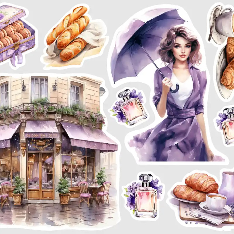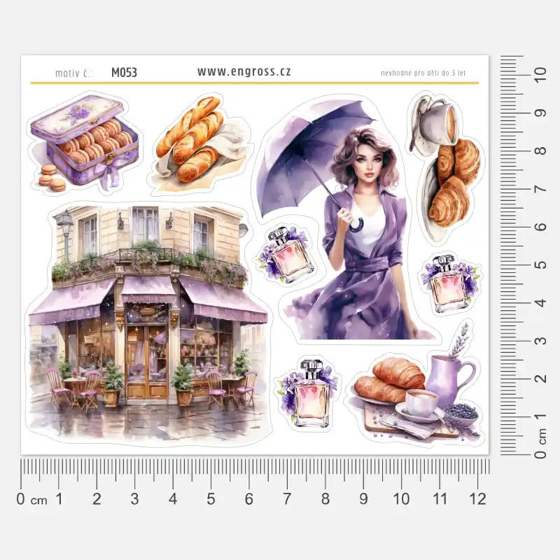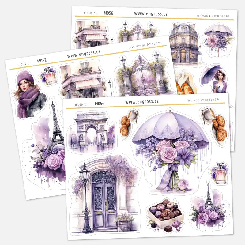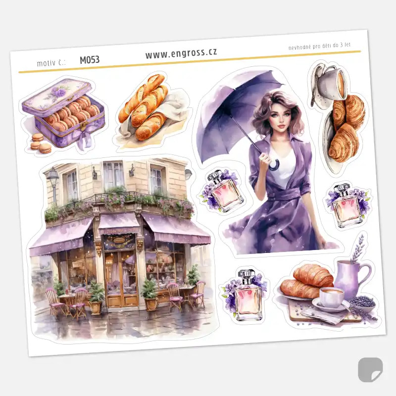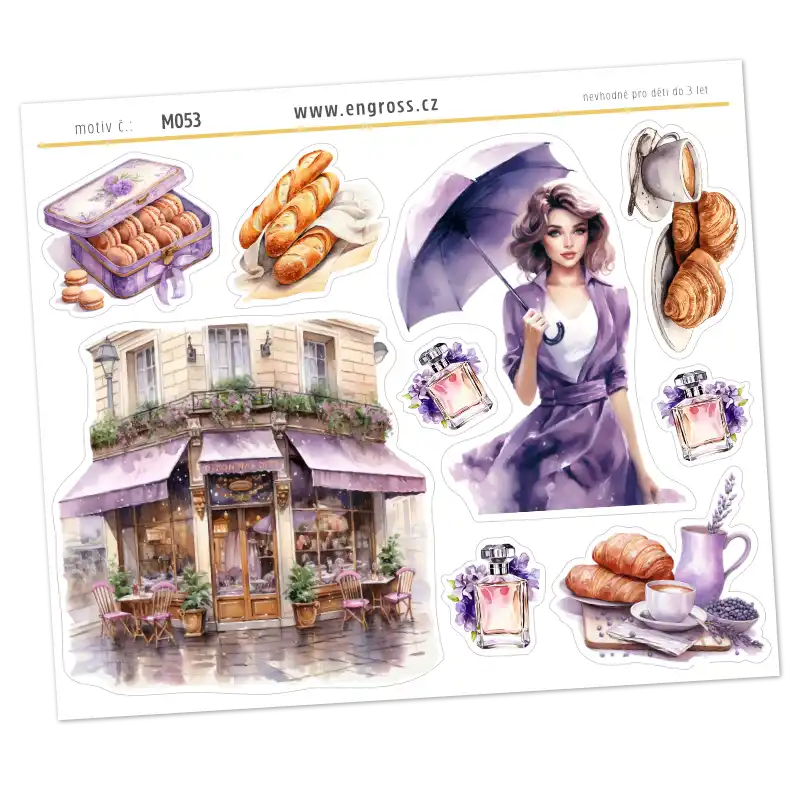 Aršík kombinující velké dekorační samolepky s drobnějšími ikonami pařížských dobrot. Akvarelové ilustrace v romantických fialových tónech jsou ideální pro zdobení týdenních přehledů i kreativní scrapbooking.