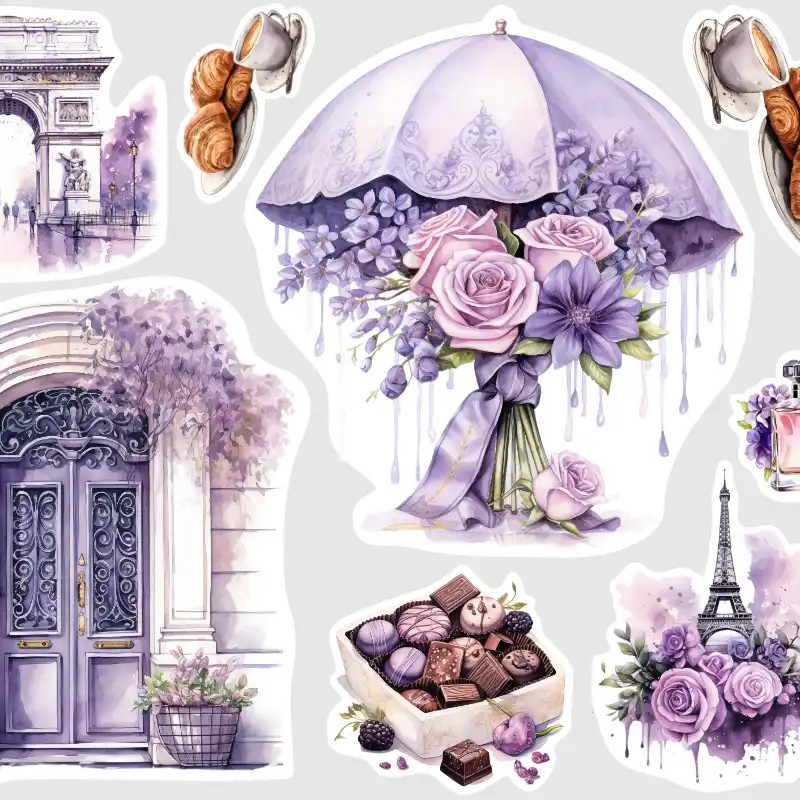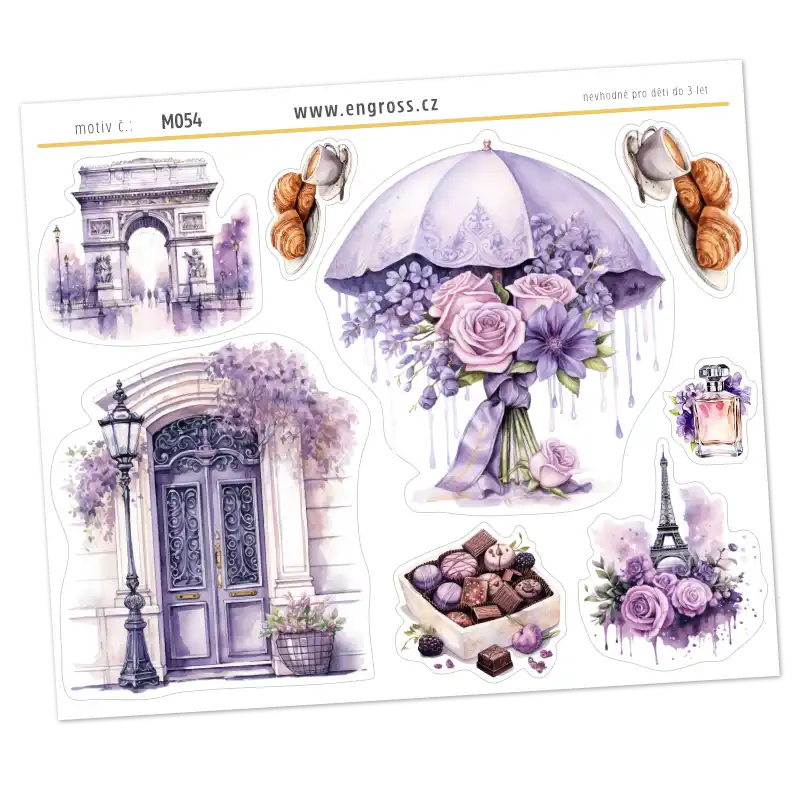 Mix velkých dekoračních motivů a menších samolepek zachycujících romantiku deštivé Paříže. Fialové akvarelové ilustrace Vítězného oblouku, historických dveří a čokoládových pralinek jsou stvořeny pro kreativní zdobení měsíčních i týdenních přehledů.