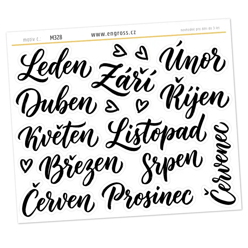 Aršík se 12 velkými kaligrafickými názvy měsíců v roce, doplněný o drobná ručně psaná srdíčka. Díky své velikosti jsou samolepky ideální jako hlavní nadpisy měsíčních sekcí v bullet journalu nebo jako dominantní prvek v kreativních denících a scrapbooku.