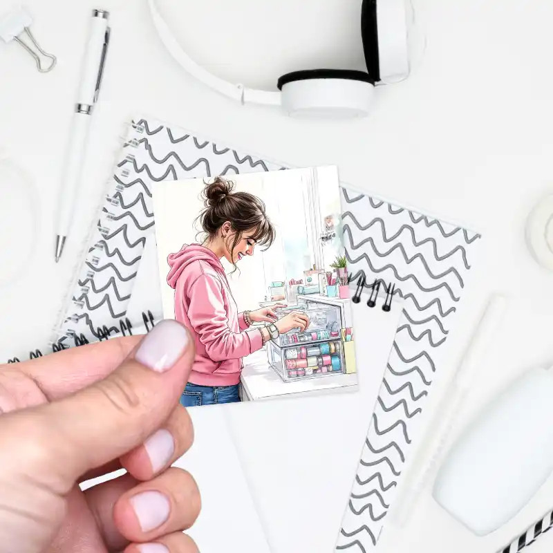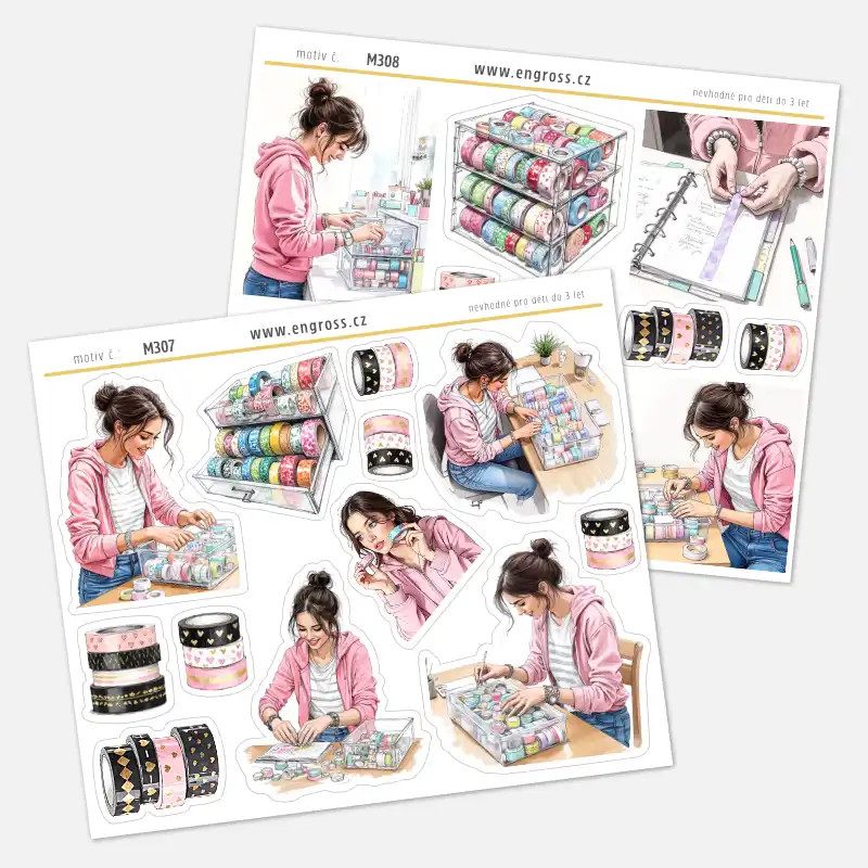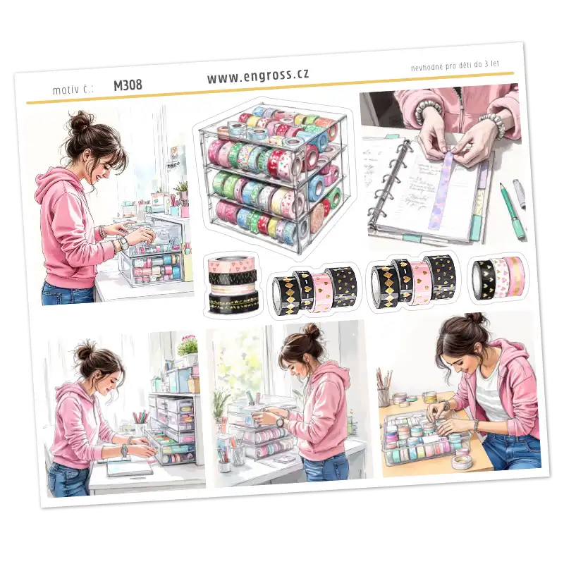Na aršíku se objevují samostatné ilustrace roliček washi pásek, box plný vzorů i postava u pracovního stolu. Každý motiv je kreslený s jemností a hravostí, aby samolepky působily útulně a přirozeně zapadly do diáře, planneru, journalu nebo kreativního zápisníku.