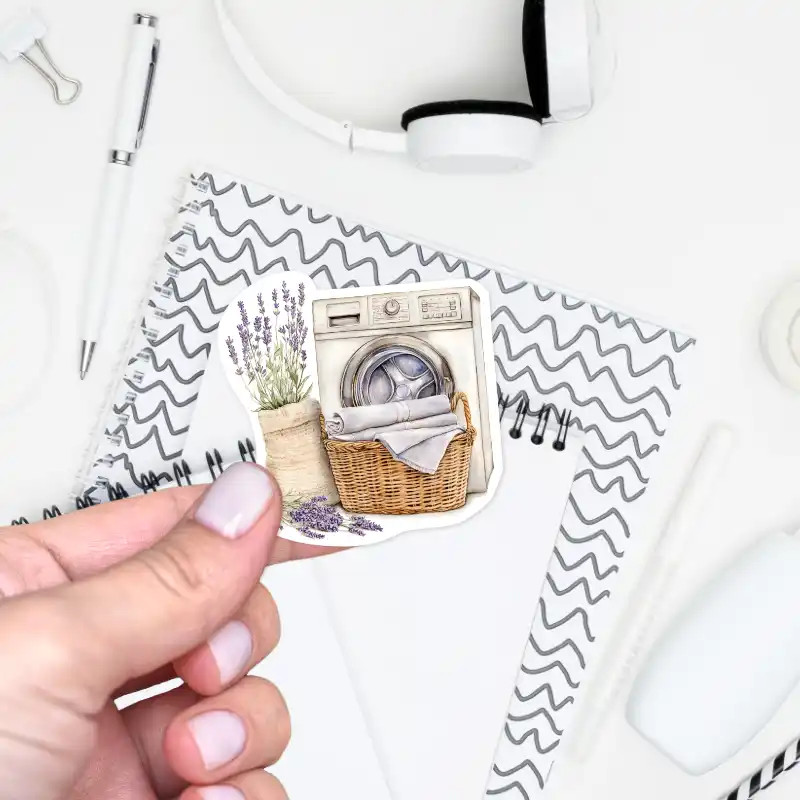 Dekorační samolepky s akvarelovými ilustracemi inspirovanými praním prádla. Tlumené odstíny šedé, béžové a levandule promění běžný úkol v klidný moment dne.