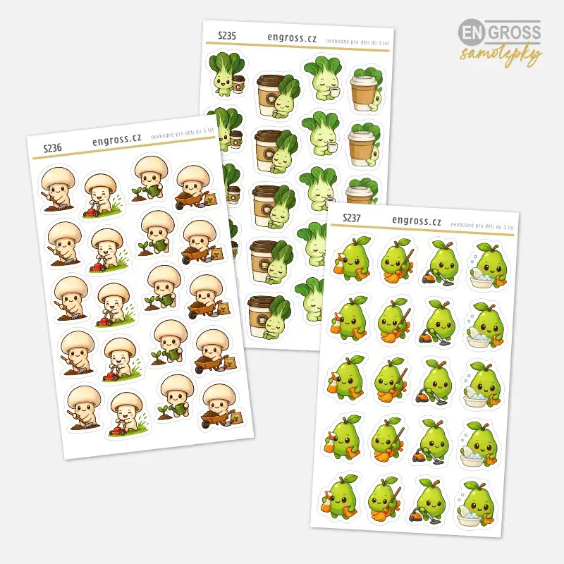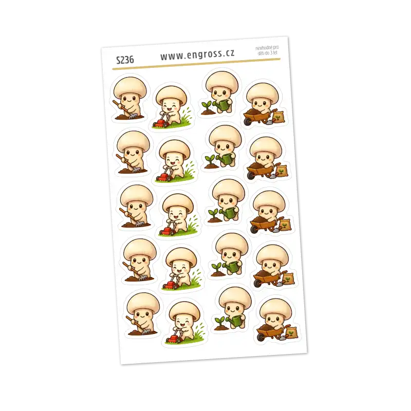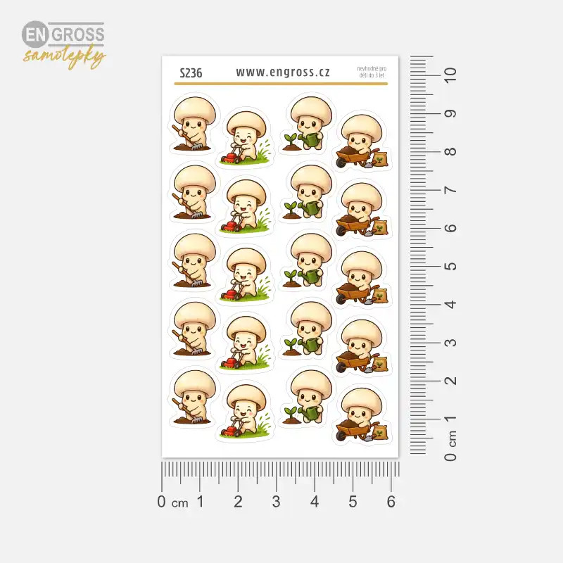 Sada 20 kusů mini samolepek v kawaii stylu s motivem žampionu při práci na zahradě. Tyto drobné nálepky z edice Frutíci jsou navrženy pro označení zahradnických prací, vyjádření radosti z pěstování nebo jako odměna za splněné venkovní úkoly. Díky své velikosti se perfektně hodí i do těch nejmenších diářů. Navrženo a vyrobeno v České republice.