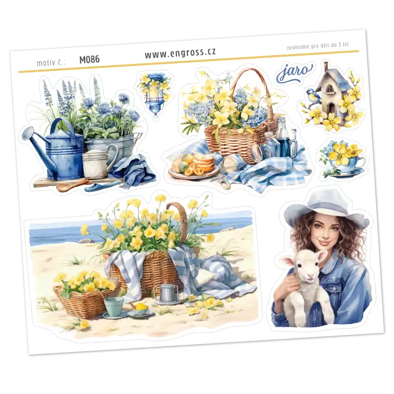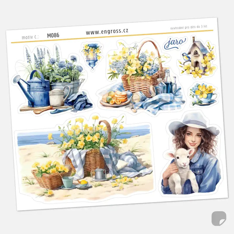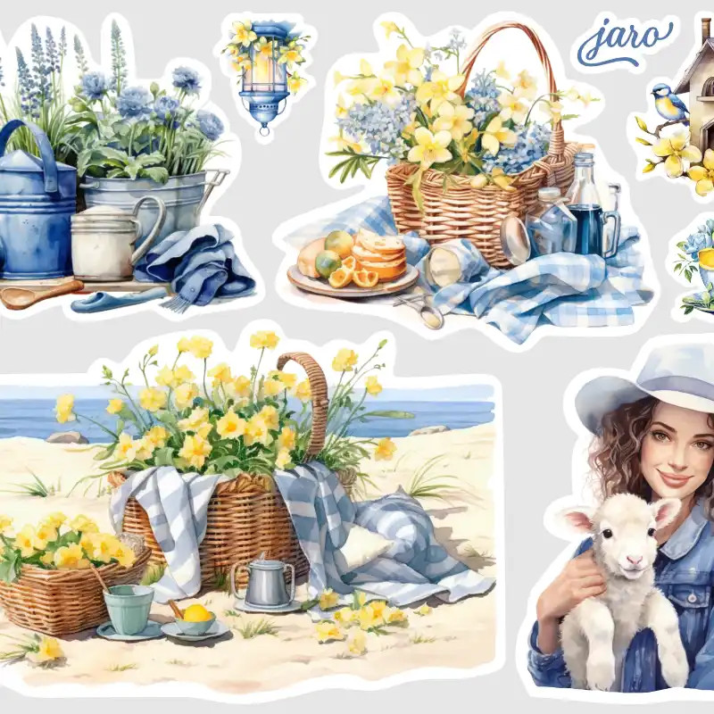 Velké dekorativní scény: Úchvatné motivy piknikových košů na pláži, žena s jarním jehňátkem a venkovská zátiší s květinami.