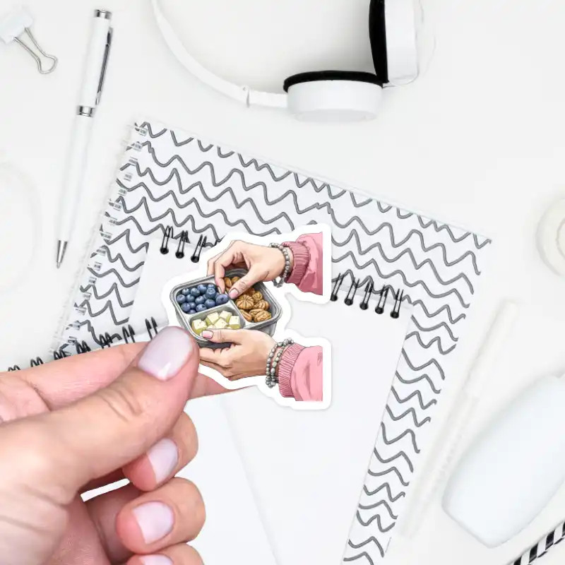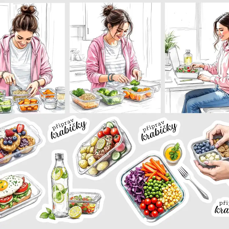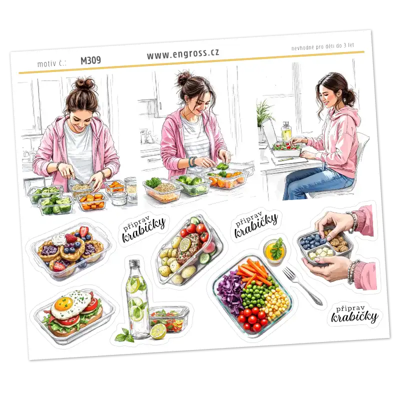Aršík zachycuje chvíle, kdy se v kuchyni chystá jídlo s rozmyslem a klidem. Tři větší samolepky s ilustracemi ženy připravující oběd do krabiček doplňují menší motivy krabiček s jídlem a krátké texty, které zápiskům dodají kontext i atmosféru dne.