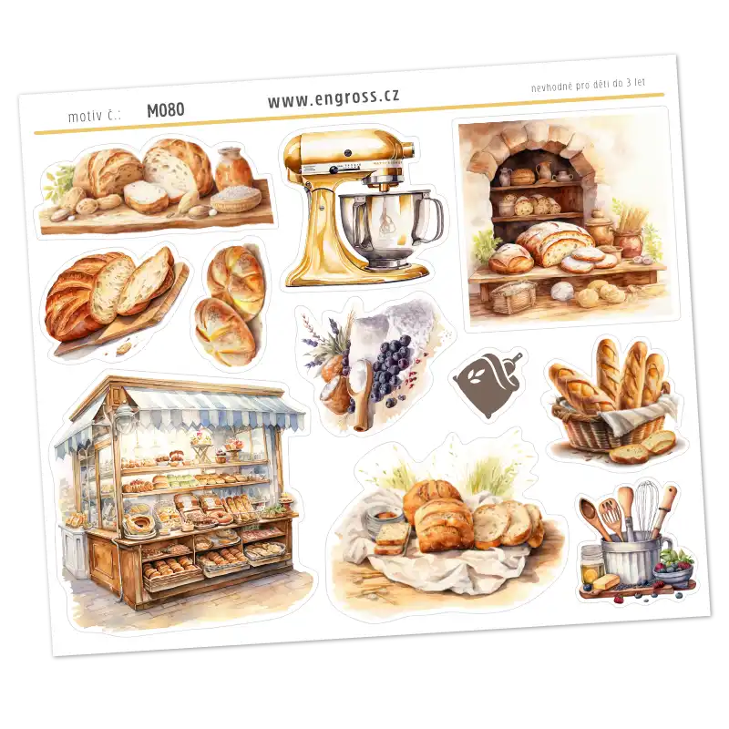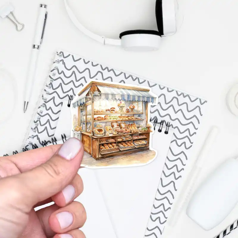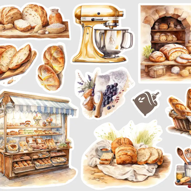 Nechte se okouzlit ilustrací pekařského stánku s látkovou markýzou, který přetéká čerstvými bagetami a bochníky. Tyto samolepky v rustikálním stylu jsou perfektní volbou pro milovnice vintage estetiky.