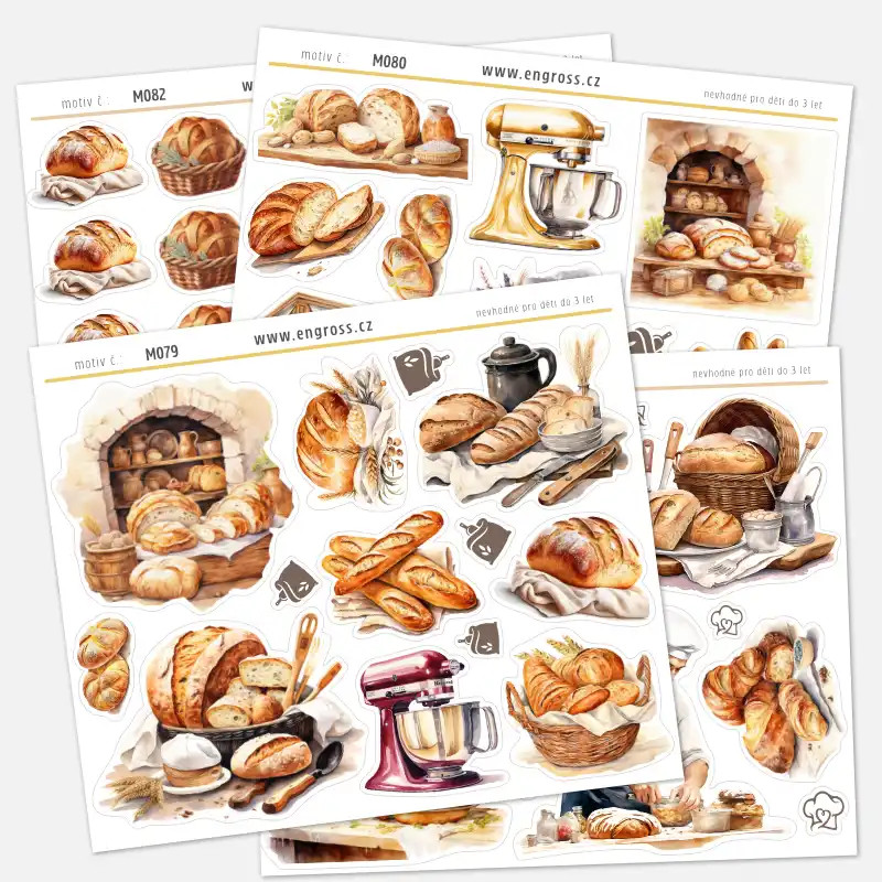 Druhý aršík z naší chlebové kolekce je inspirován nostalgií starých trhů a pouličního prodeje. Hlavním motivem je malebný pekařský stánek s pruhovanou markýzou, který vypadá, jako by vypadl ze stránek historické obrázkové knihy. Stánek je plný pekařských dobrot, které doplňují samostatné ilustrace chlebů v proutěných košících.