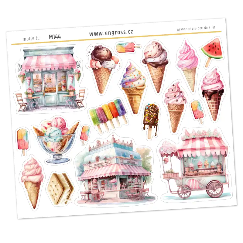 Sada 19 kusů dekorativních samolepek s jemnými akvarelovými (watercolor) ilustracemi na téma léto a zmrzlina. Aršík obsahuje motivy zmrzlinových stánků, cukráren, kornoutů i bohatě zdobených pohárů. Ideální pro kreativní zdobení bullet journalu, prázdninového deníku nebo scrapbooking. Navrženo a vyrobeno v České republice.