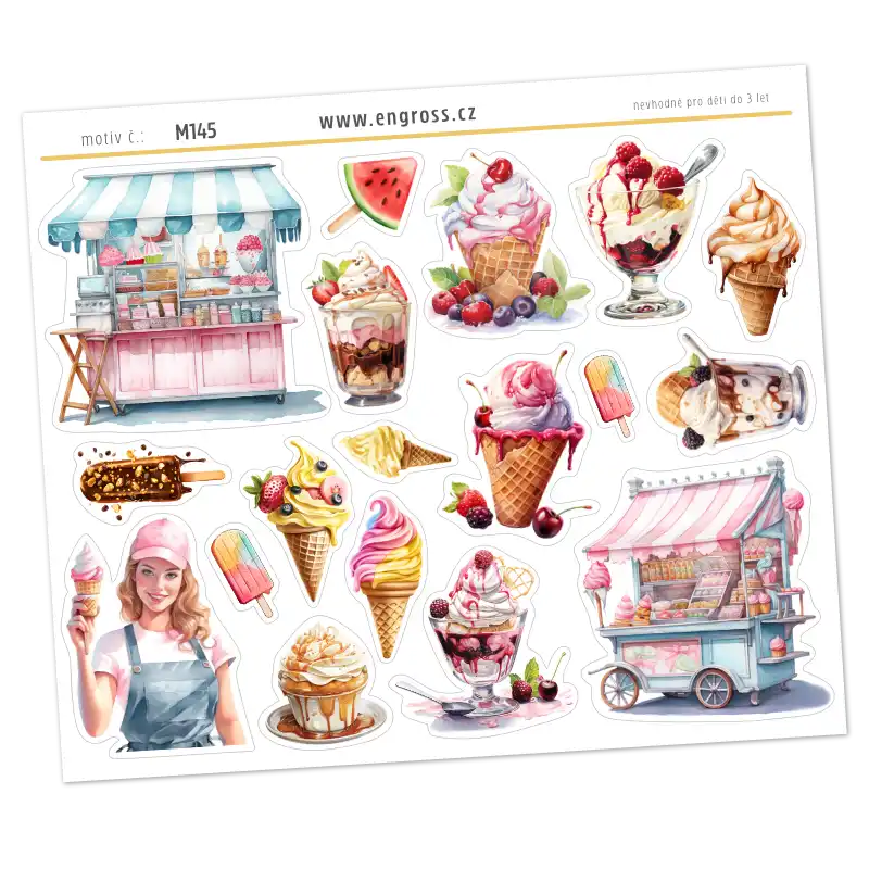Sada 18 kusů dekorativních samolepek s propracovanými akvarelovými (watercolor) ilustracemi zmrzlinových pohárů, kopečkové zmrzliny a stylových doplňků. Aršík obsahuje větší motivy ideální pro titulní strany měsíců nebo hlavní dekoraci v bullet journalu a scrapbookingu. Navrženo a vyrobeno s láskou v České republice.