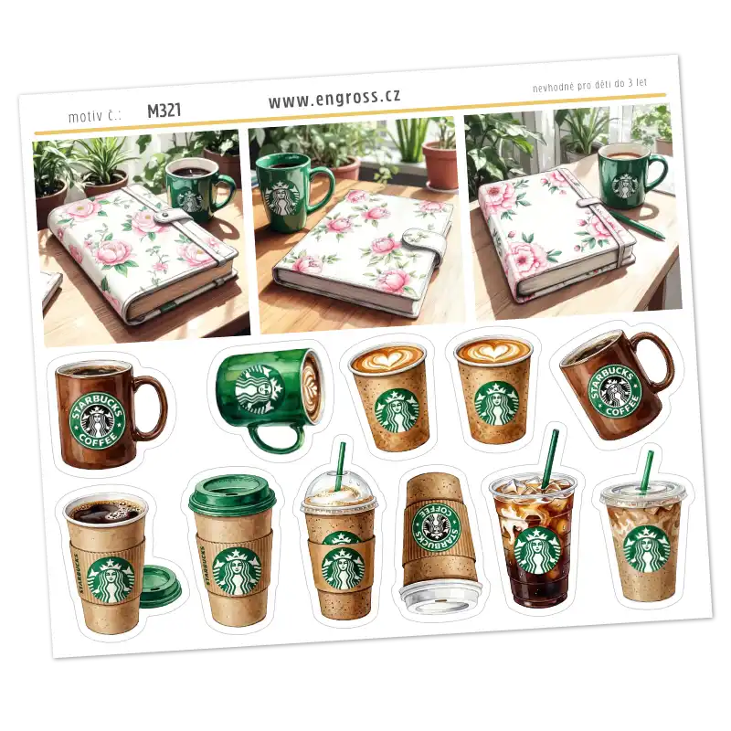 Aršík dekoračních samolepek s motivem kávy a diáře. Obsahuje mix 11 samolepek: čtvercové scenérie s rozkvetlými plánovači a hrnky, a také samostatné ikonky různých druhů káv (iced coffee, take-away kelímky, keramické šálky) v ikonickém zeleném designu.