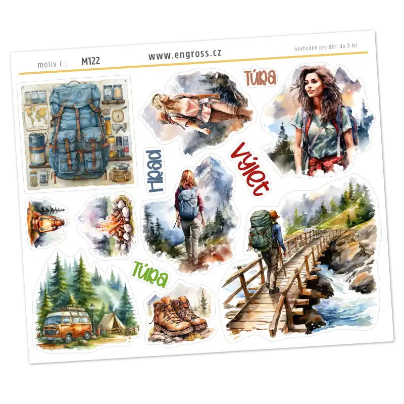 Aršík z kolekce Turistika s 13 akvarelovými motivy pro cestovatele. Obsahuje ilustrace plně sbaleného batohu, retro obytné dodávky (vanlife), turistek na mostě i v horách a nezbytné nápisy pro plánování výletů. Ideální pro zdobení deníků, fotoalb a kreativních plánovačů.