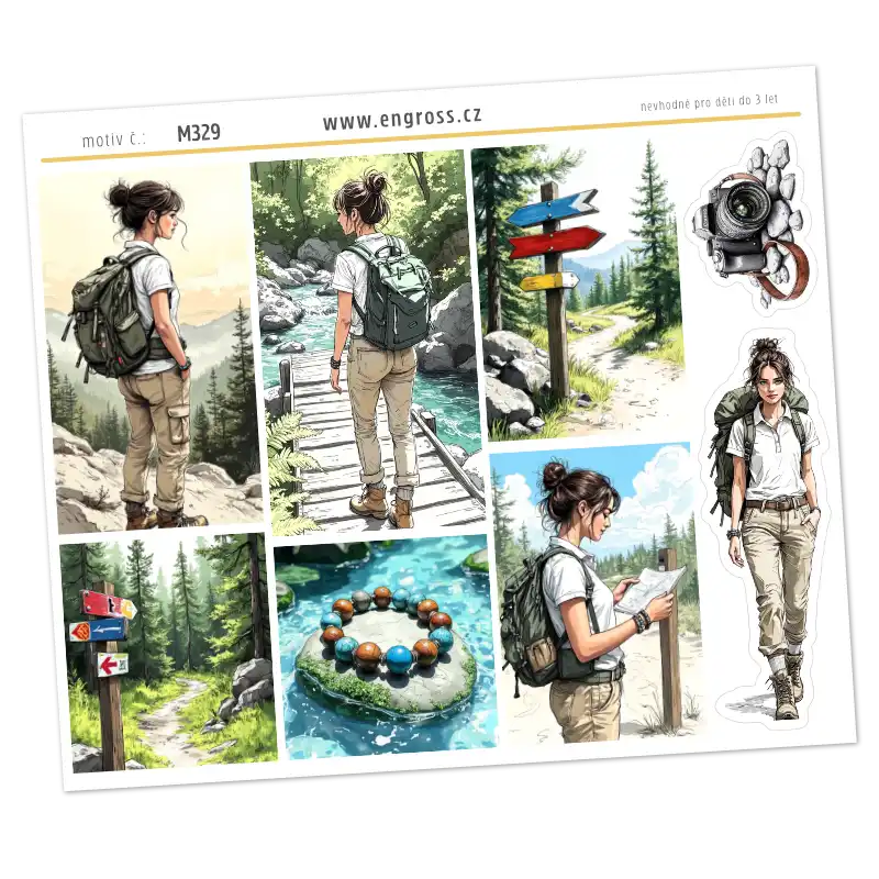 Aršík velkých dekorativních samolepek ve stylu pencil sketch na téma horská turistika. Sledujte hrdinku Miu při plánování cesty s mapou, výstupu na vrchol i odpočinku v přírodě. Boxy jsou doplněny o motivy směrovek, fotoaparátu a přírodních detailů, které jsou perfektní pro bullet journal, scrapbooking i kreativní deníky.