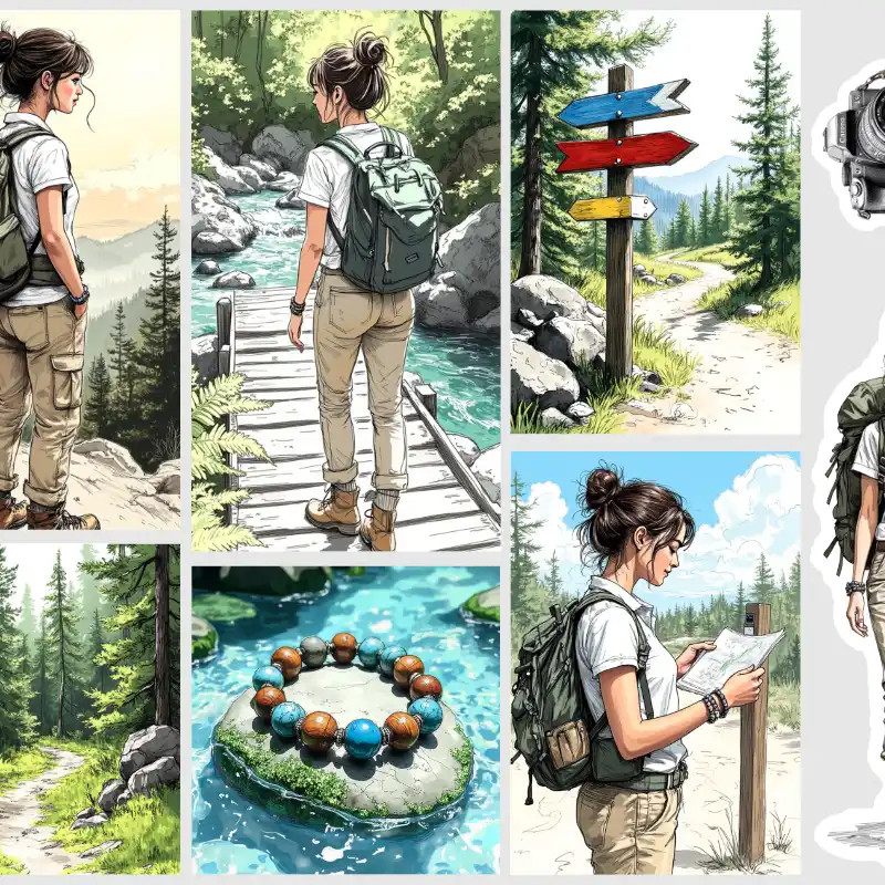 Tematické detaily: Doplňkové motivy turistických směrovek v lese, detail profesionálního fotoaparátu pro zachycení vzpomínek a spirituální náramek na kameni v potoce.