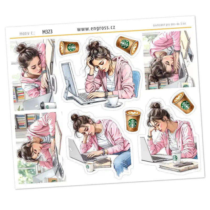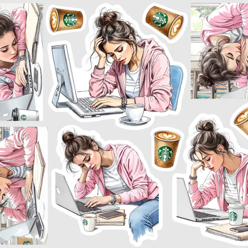 Sada 10 dekoračních samolepek zachycujících únavu při práci u počítače. Mix motivů ženy v růžové mikině, která bojuje s ospalostí, doplněný o stylové šálky kávy. Jemný styl tužkové skici a akvarelu v béžových a růžových tónech.