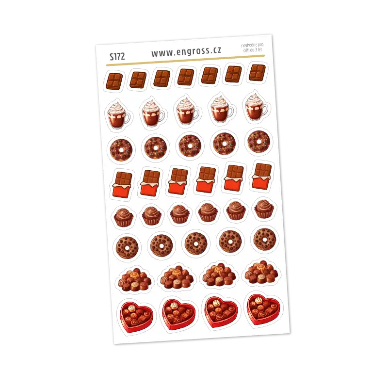 Skvělý doplněk k aršíkům „Zrzka a bonboniéra“ a „Zrzka a čokoláda“, když je potřeba přidat sladkých detailů víc než obvykle. Ale poradí si i samostatně – třeba když chceš svému diáři dopřát luxusní čokoládovou tečku na stránce. Pozor – nalepování může vyvolat neovladatelnou chuť na sladké...