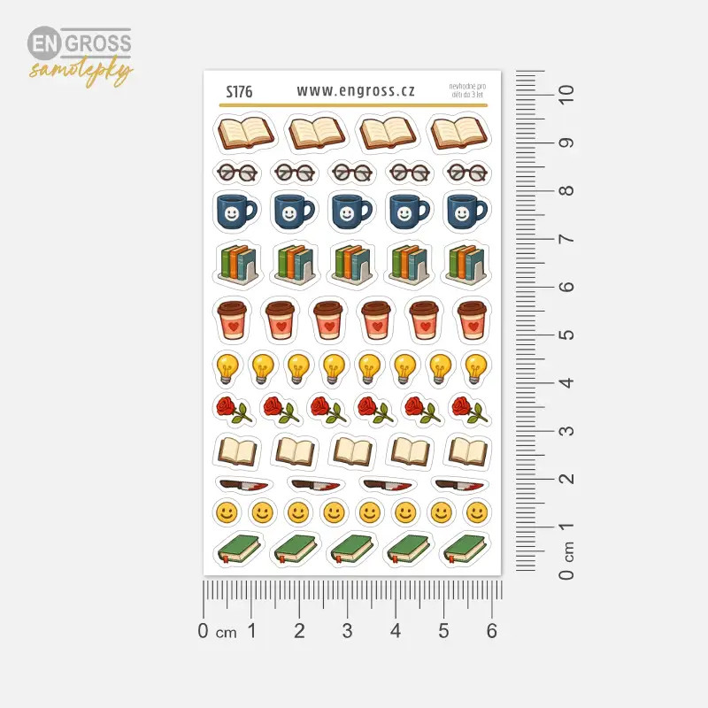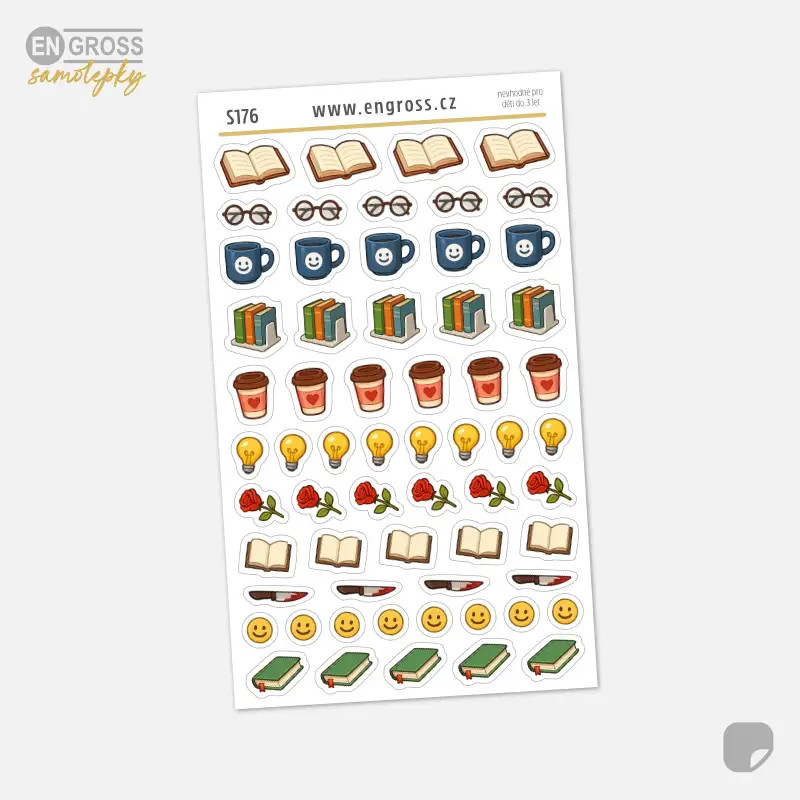 Vdechni svému diáři nebo čtenářskému deníku nový život s těmito mini samolepkami, které oslavují kouzlo knih a literatury. Na jednom aršíku najdeš celou škálu barevných ikonek – knihy, hrníčky kávy, růže pro romantické romány, žárovky pro naučné tituly, smajlíky pro humorné čtení a dokonce i nože pro milovníky detektivek a hororů.