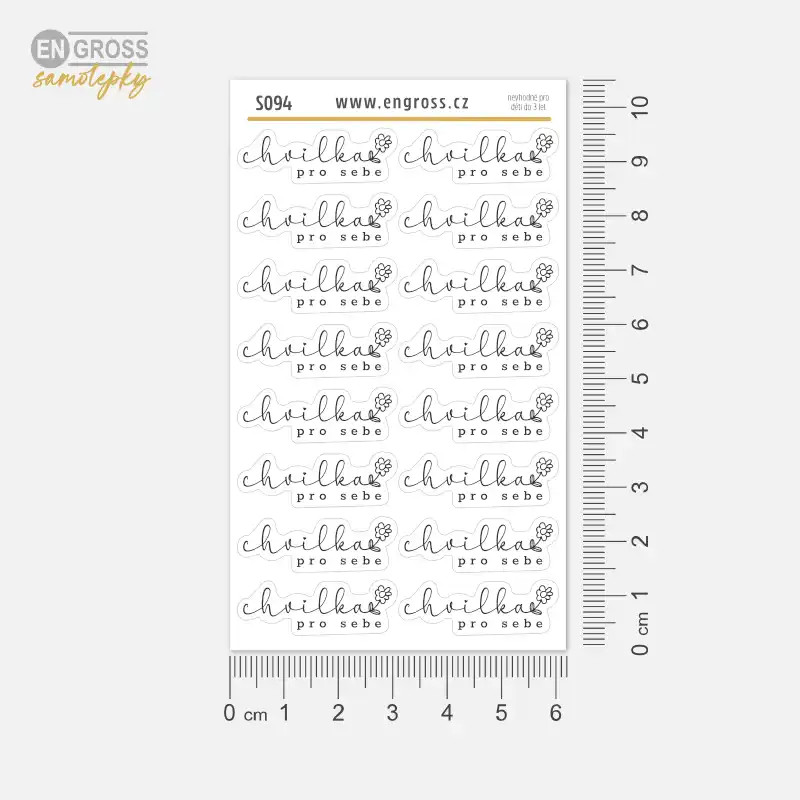 V dnešní uspěchané době je snadné zapomenout na vlastní odpočinek. Naše autorské textové samolepky „Chvilka pro sebe“ jsou tu proto, aby vám pomohly vyhradit si v diáři prostor pro relaxaci, meditaci nebo prosté nicnedělání. Aršík obsahuje celkem 16 nápisů vyvedených v elegantním psaném fontu, který působí vkusně a nerušivě v jakémkoliv typu diáře či bullet journalu.