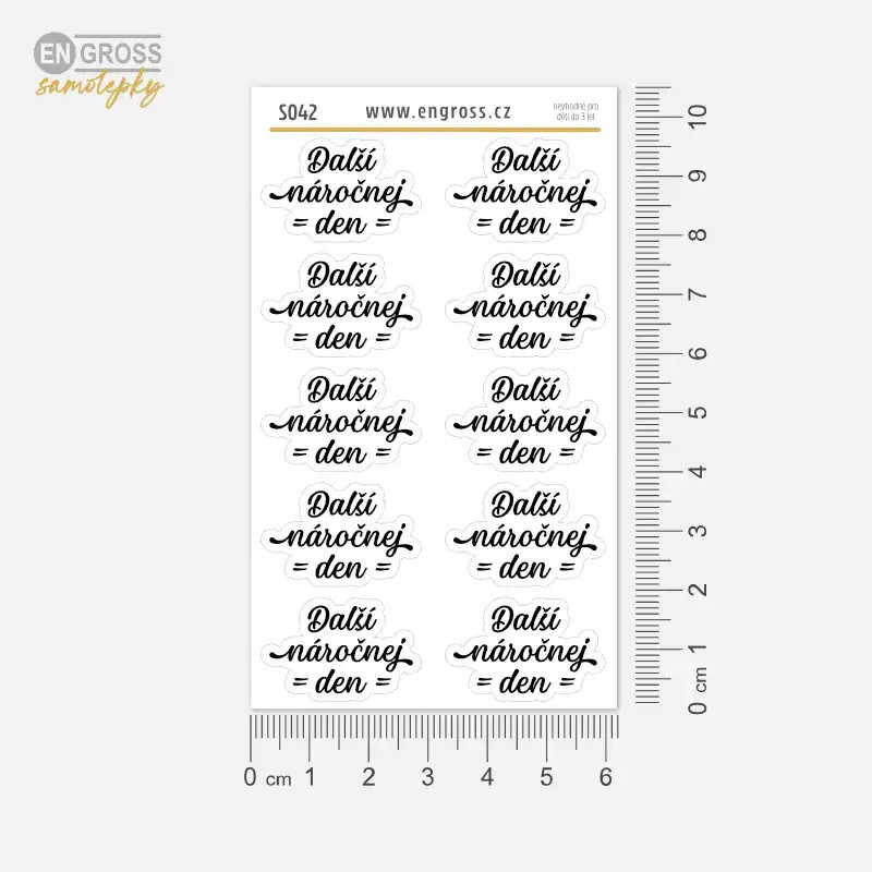 Aršík samolepek vznikl pro dny, které nejsou instagramové, ale skutečné. Nápis „Další náročnej den“ dává prostor realitě, únavě i lehkému nadhledu – bez tlaku na pozitivitu, bez zbytečných frází.
