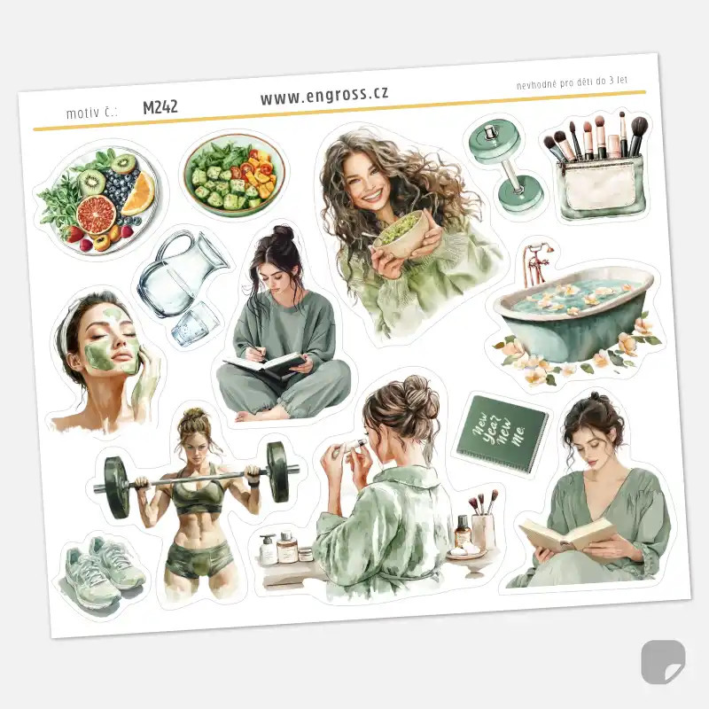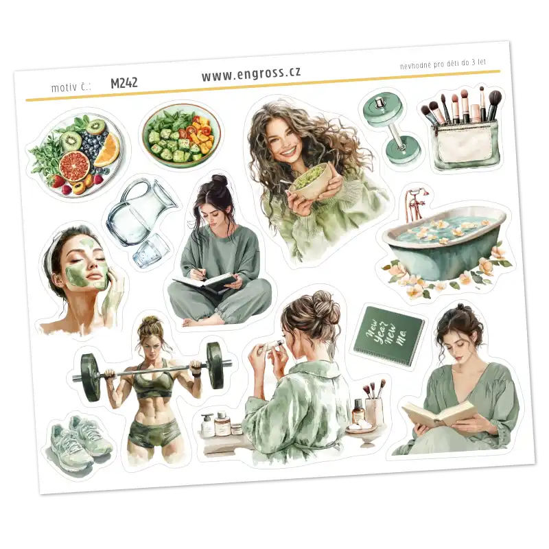 Hledáte způsob, jak si v diáři esteticky vyznačit čas pro svůj self-care režim? Náš první aršík ze série Zdravý životní styl vás okouzlí jemnými akvarelovými ilustracemi v moderním mátovém odstínu. Tento set je oslavou domácí pohody a vědomého přístupu k vlastnímu tělu i duši.