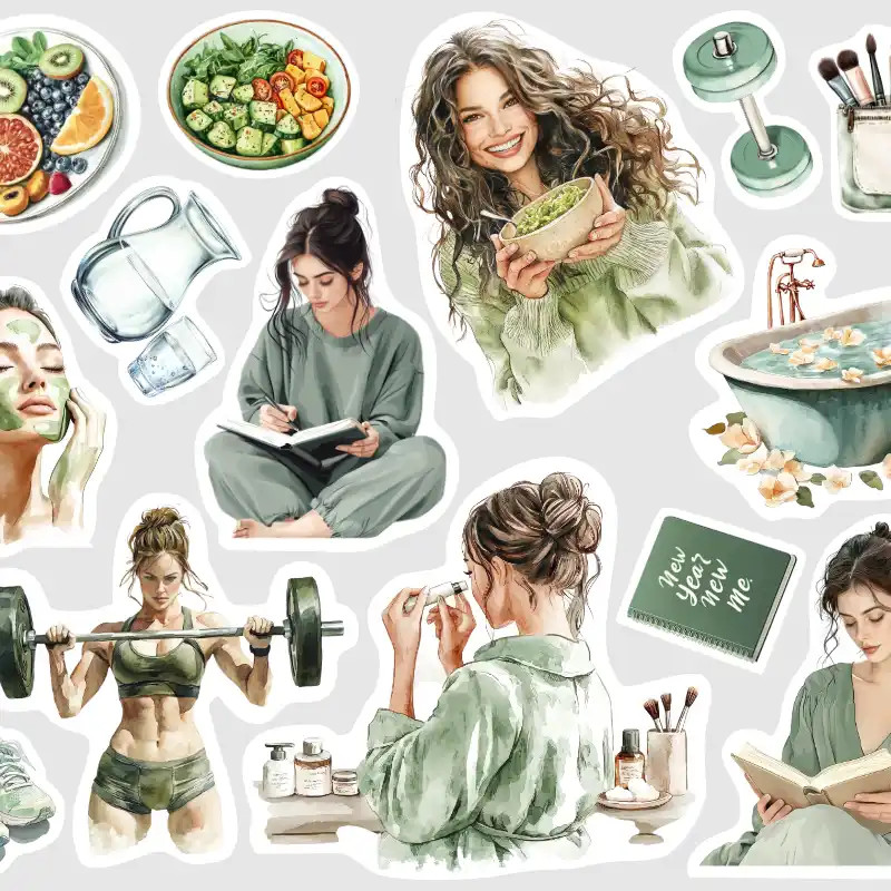 Vneste do svého diáře klid a eleganci s watercolor samolepkami zaměřenými na každodenní rituály. Od horké vany po psaní deníku – tyto ilustrace vám připomenou, že péče o sebe je prioritou.
