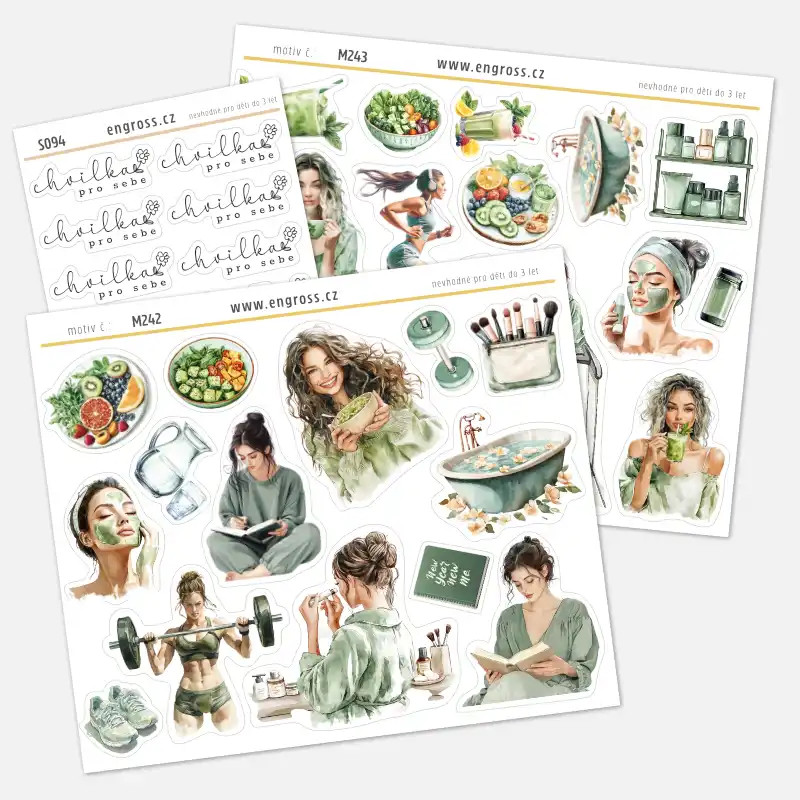 Všechny ilustrace jsou laděny do jednotné mátově zelené barvy, což zaručuje, že váš diář bude vypadat profesionálně a esteticky sjednoceně. Samolepky vyrábíme v ČR na kvalitní materiál s precizním ořezem. Skvěle se kombinují s první variantou "Wellness rituály" pro vytvoření kompletního zdravotního deníku.