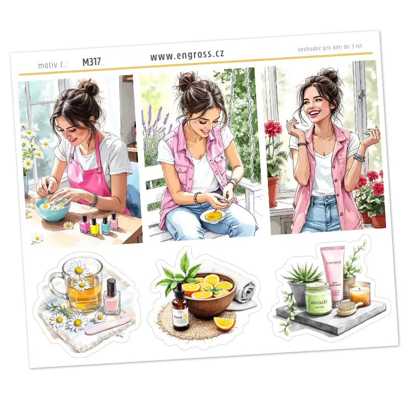 Každá žena si zaslouží být hýčkána. Náš první aršík ze série Péče o ruce je navržen tak, aby vám v diáři připomněl, že je čas odložit povinnosti a věnovat se chvíli sobě. Ilustrace jsou laděny do svěžích růžových tónů a působí v diáři velmi žensky a elegantně.
