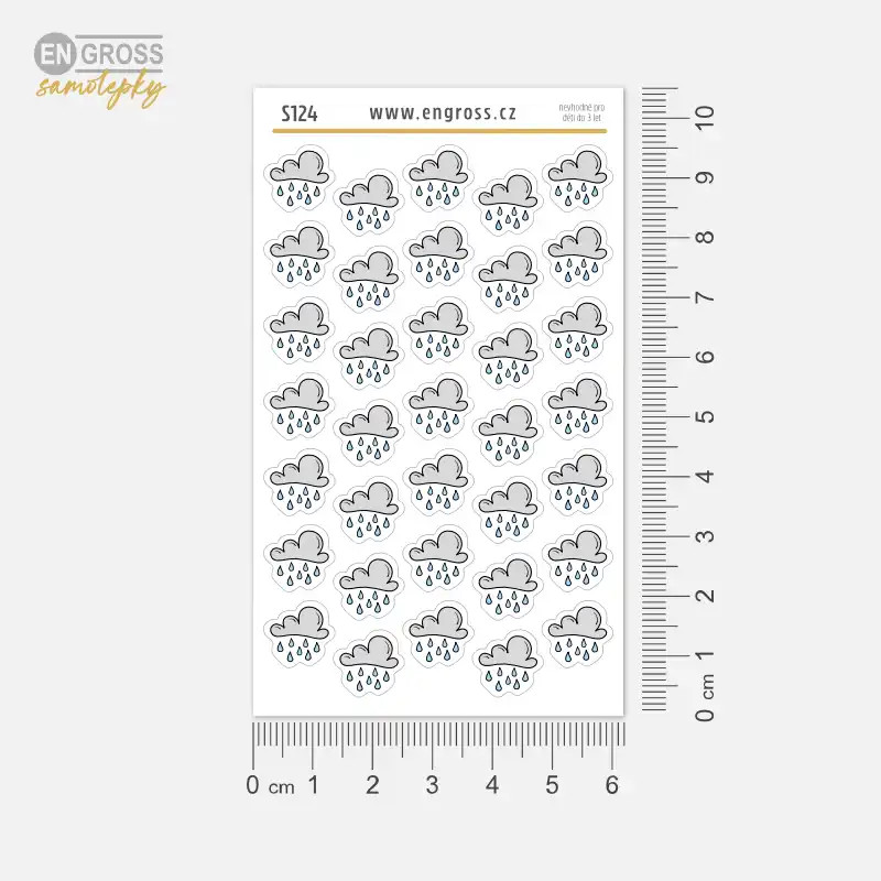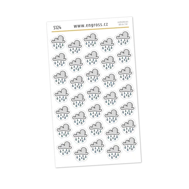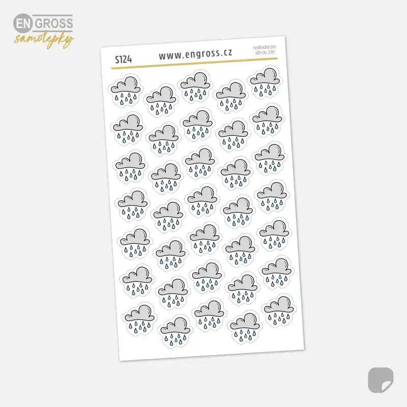 Dešťové mraky a kapky deště - samolepky pro dny, kdy není dobré zapomenout deštník. Tento aršík samolepek do diáře přináší 35 malých nálepek s motivy deště, navržených tak, aby se snadno vešly i do drobných políček plánovače.