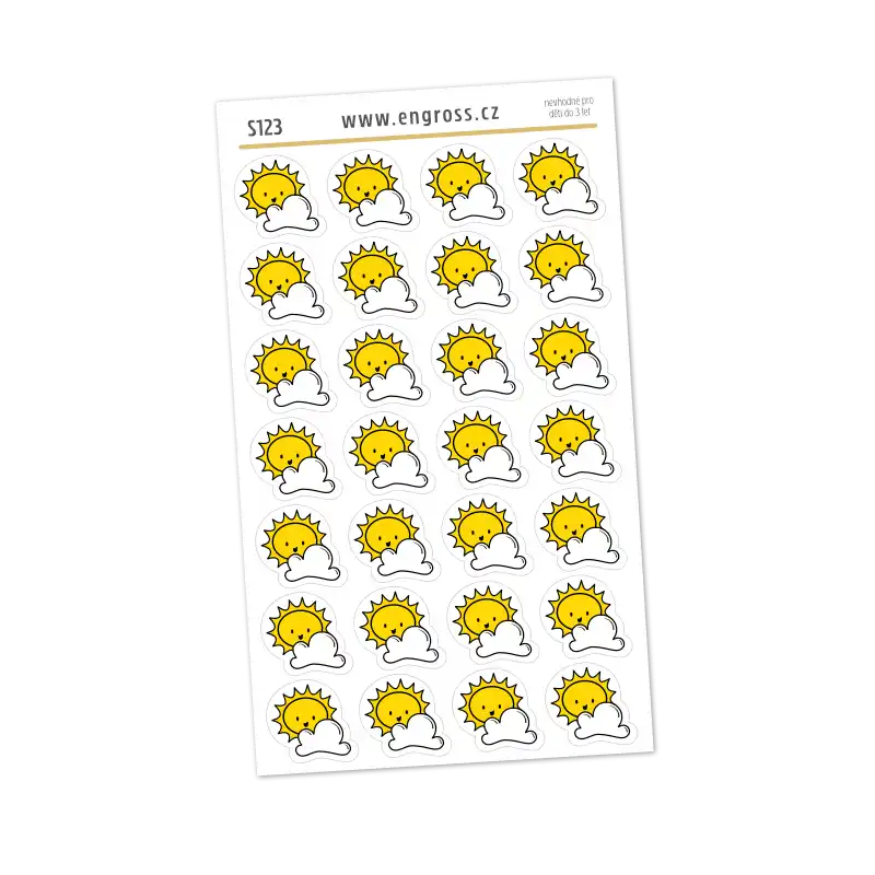Na archu se nachází 28 malých samolepek s ručně kresleným sluníčkem, které se jemně usmívá a dodává plánování pozitivní energii.