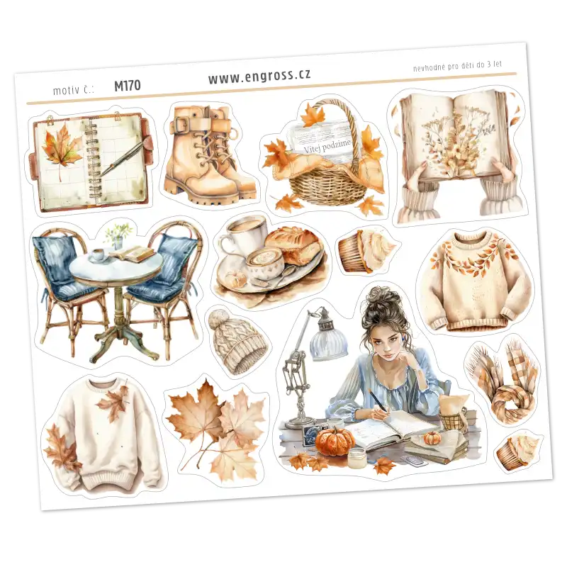 Samolepky jsou vhodné pro všechny typy diářů, bullet journalů i deníků. Arch o velikosti 12,3 × 10,5 cm je kompaktní, ale plný inspirace. Je součástí kolekce pěti aršíků, které spolu ladí jako svetr s šálou. Ideální pro milovníky journalingu, estetiky a podzimního klidu.