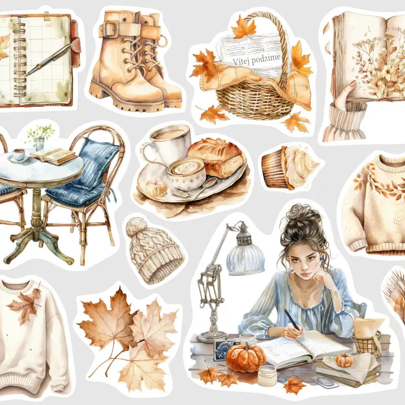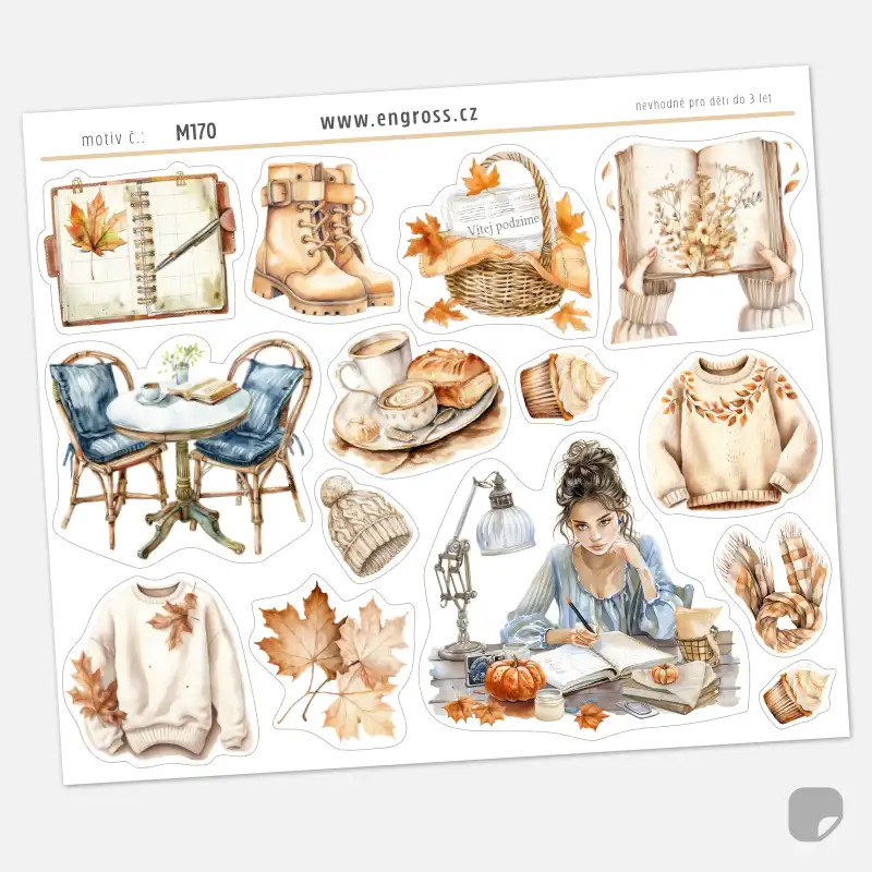 Samolepky s akvarelovými ilustracemi podzimu – zlaté listí, pletené svetry, pořádné boty, teplá káva a dobrá kniha. Ten pravý podzim pro bullet journal, diář i deník.