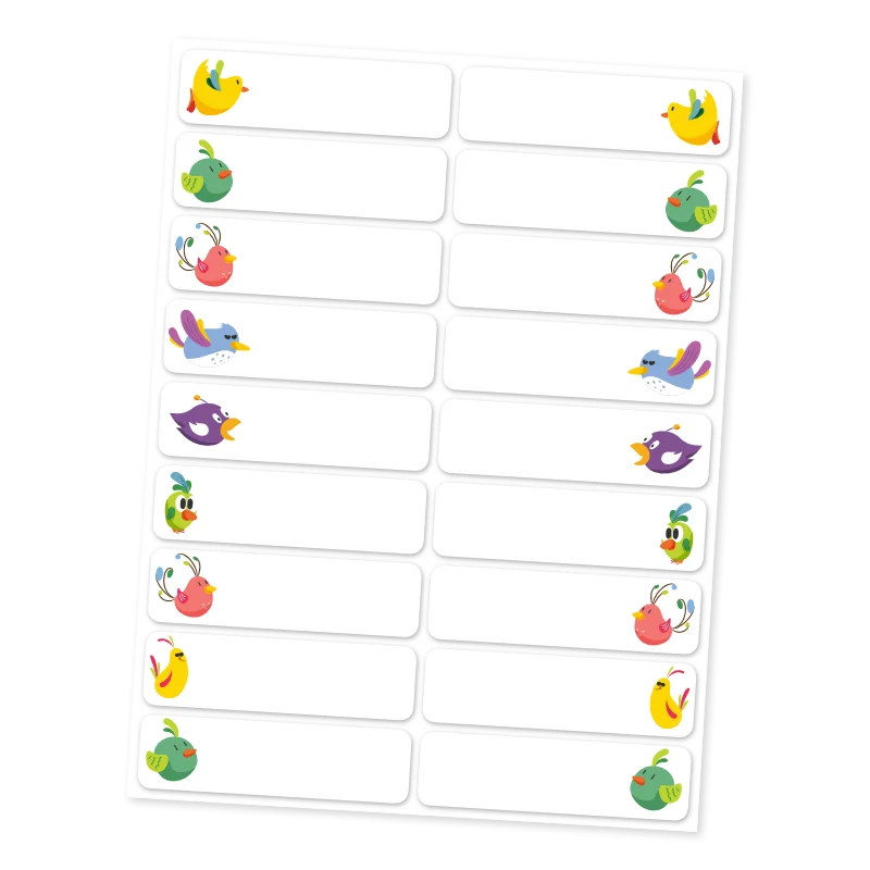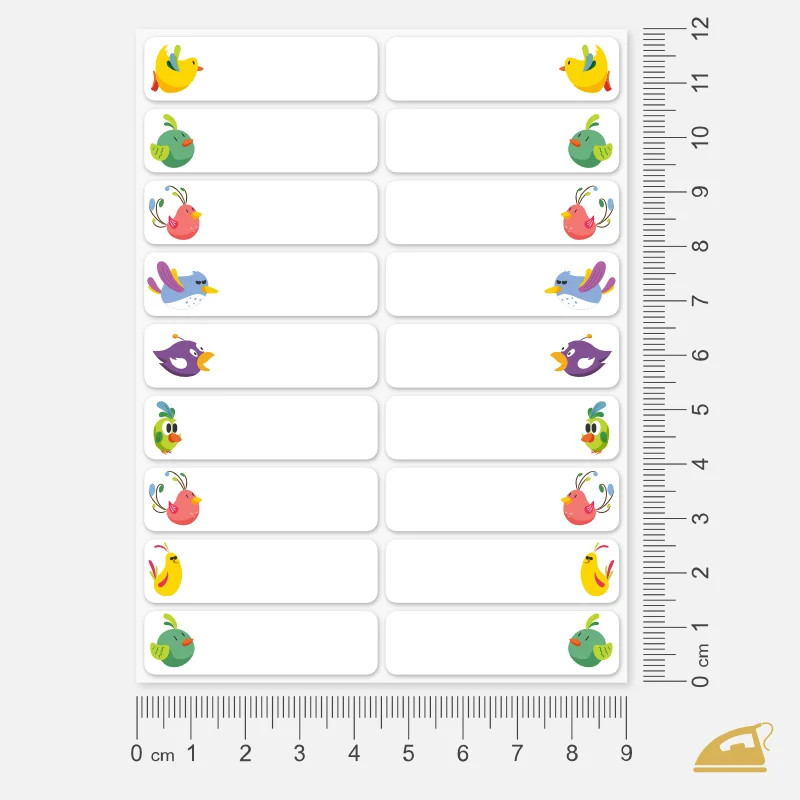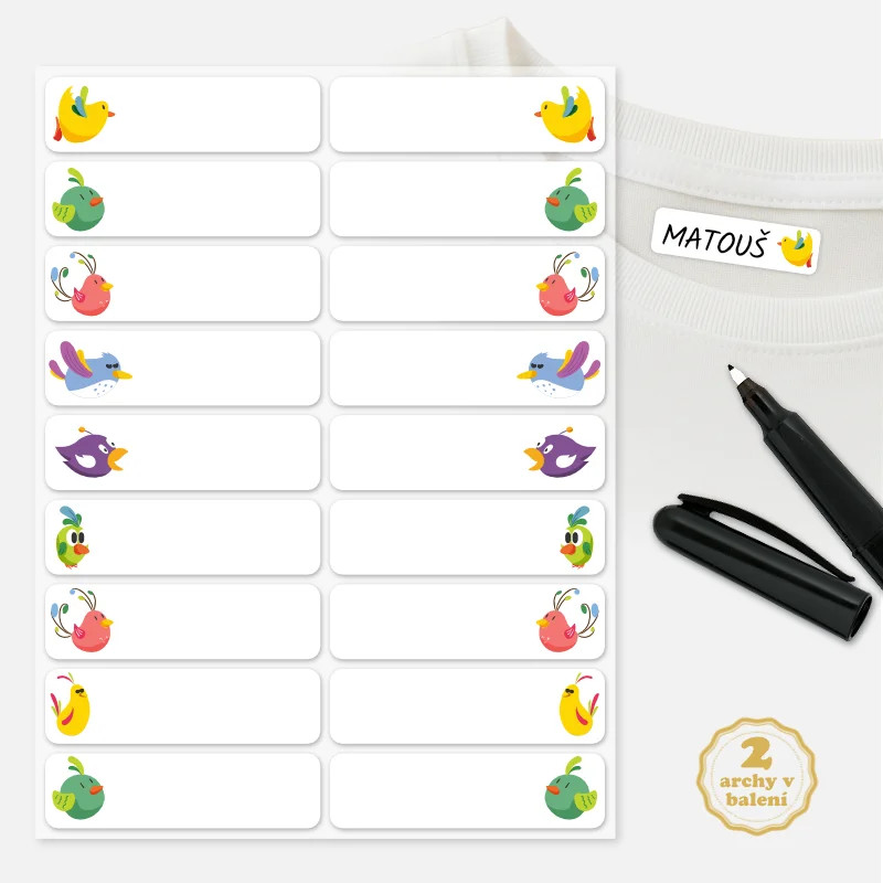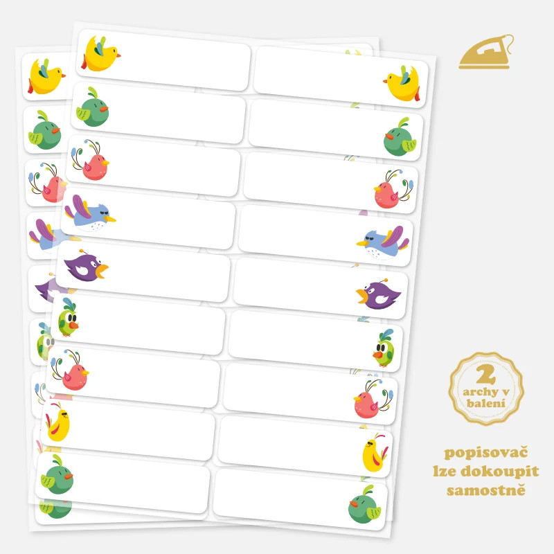 Balení obsahuje sadu dvou archů, na kterých je celkem 36 bílých nažehlovacích štítků s barevnými ptáčky. Každý štítek má rozměr 43 × 12 mm, což poskytuje dostatek prostoru pro čitelné napsání jména a zároveň zůstává nenápadný na oblečení.