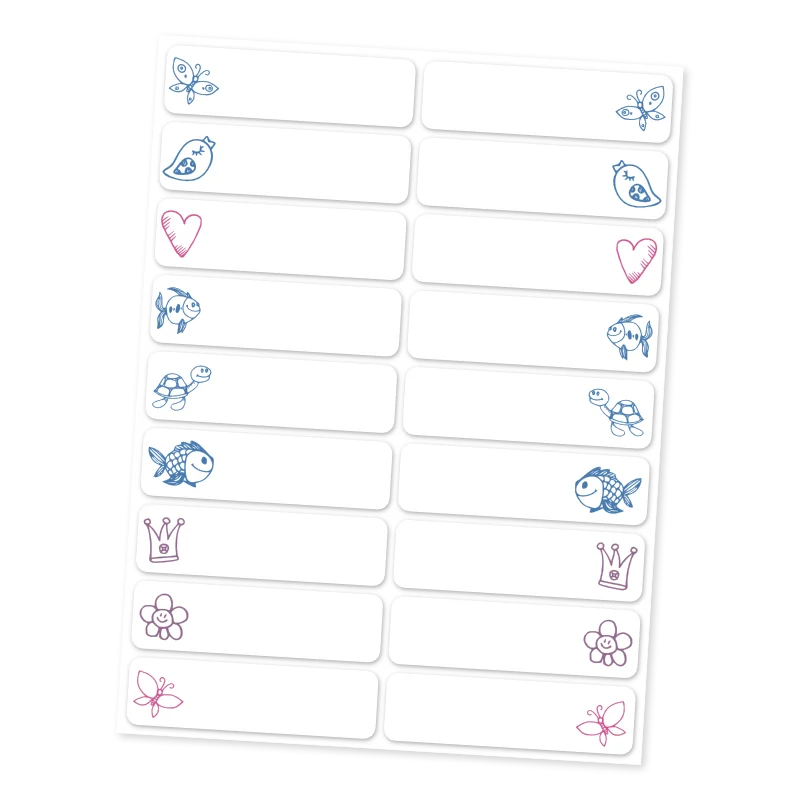 Nažehlovací jmenovky na oblečení s kreslenými motivy ptáčků, ryb, srdíček, motýlů a květin vytvářejí lehký a něžný vzhled, který si malé holčičky snadno oblíbí.