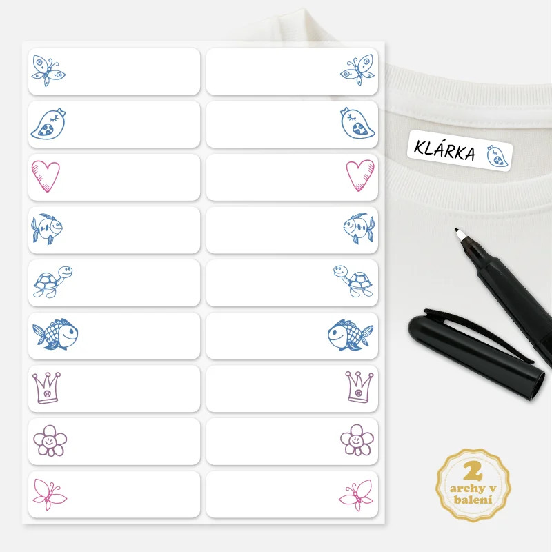 Jmenovky se hodí pro označení oblečení do školky, školy, nebo na tábory. Aplikace je jednoduchá – štítky se vystřihnou z archu a nažehlí běžnou žehličkou podle přiloženého návodu. Po nažehlení se jméno doplní popisovačem z naší nabídky, se kterým jsou jmenovky testované na odolnost vůči praní.