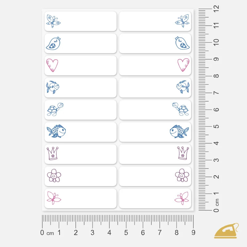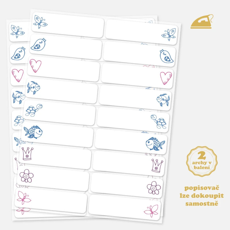 Balení obsahuje dva archy s celkem 36 nažehlovacími štítky. Každý štítek poskytuje dostatek prostoru pro napsání jména a zároveň zůstává decentním doplňkem oblečení. Díky různorodým obrázkům lze oblečení snadno rozlišit a dítě si své věci rychle pozná.