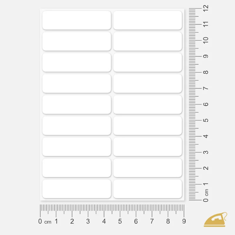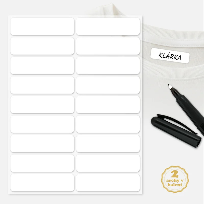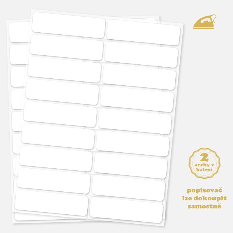 Univerzální bílé popisovací nažehlovací jmenovky pro jednoduché a přehledné označení oblečení dětí, dospělých i seniorů.