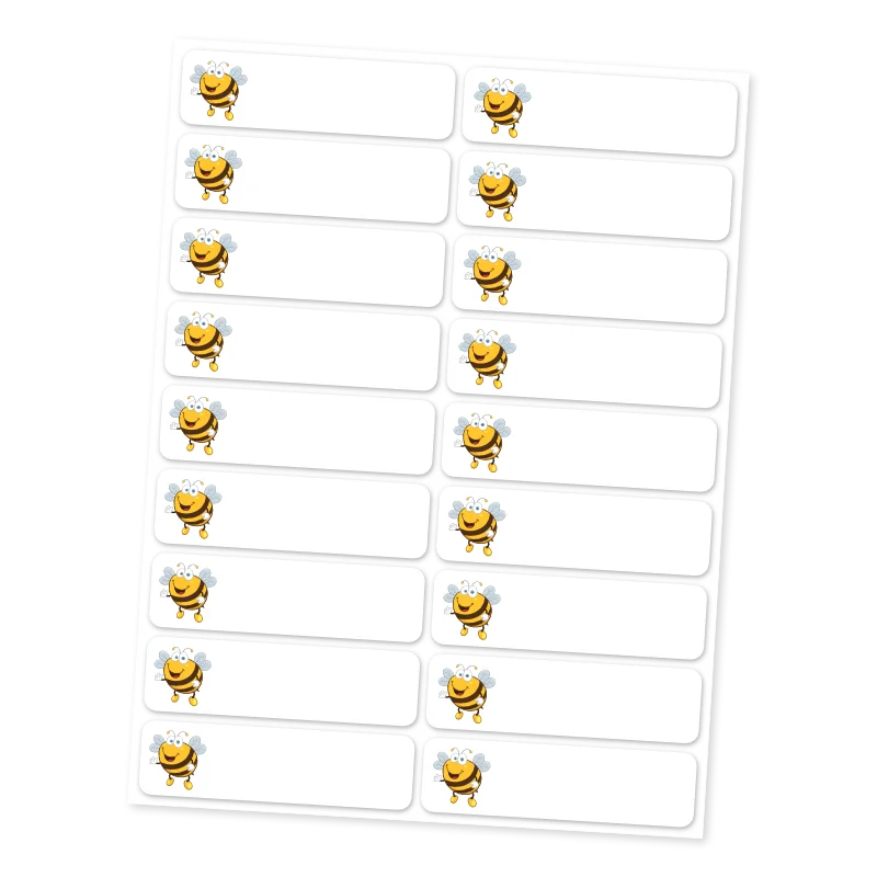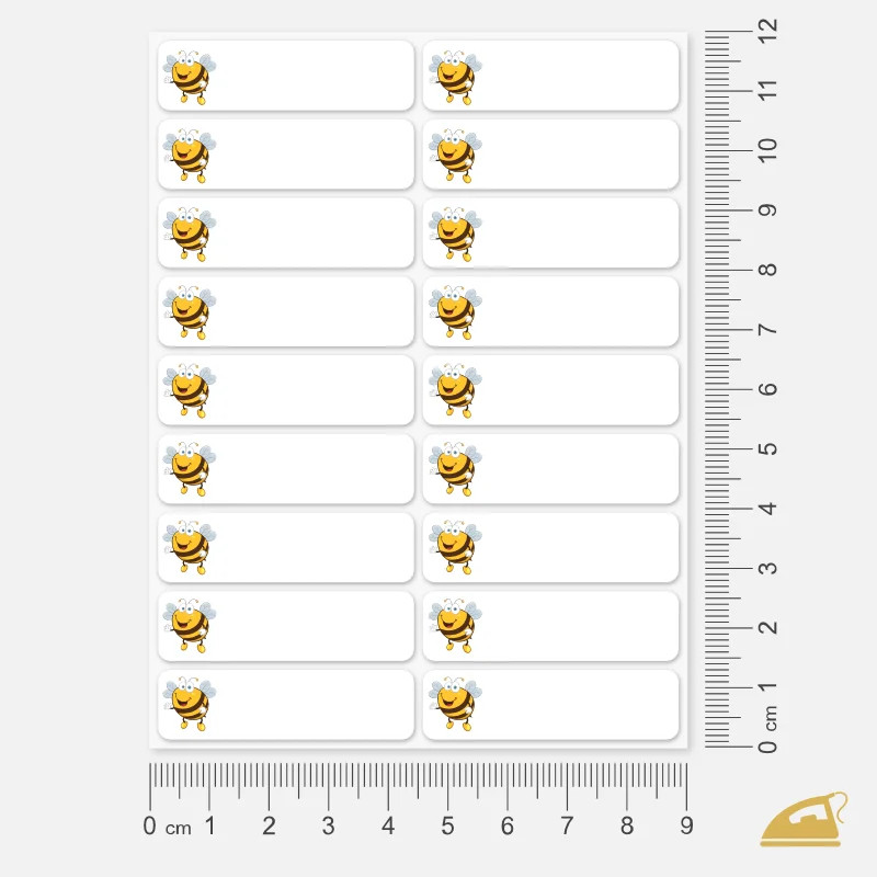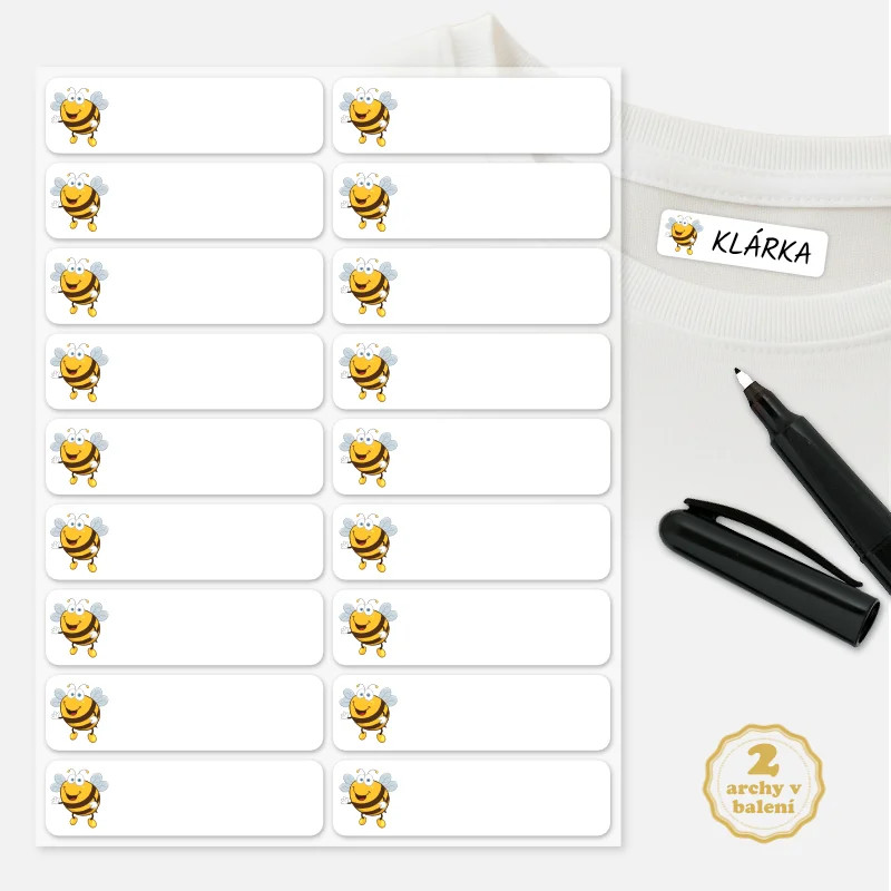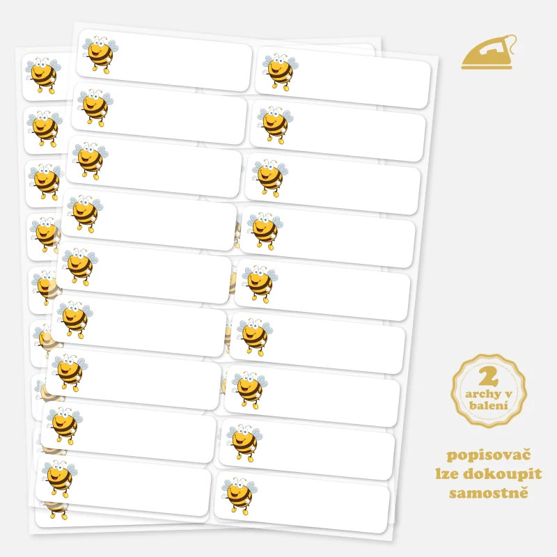Nažehlovací jmenovky s motivem včelky pro snadné a přehledné označení oblečení malých dětí. Jmenovky jsou popisovatelné.