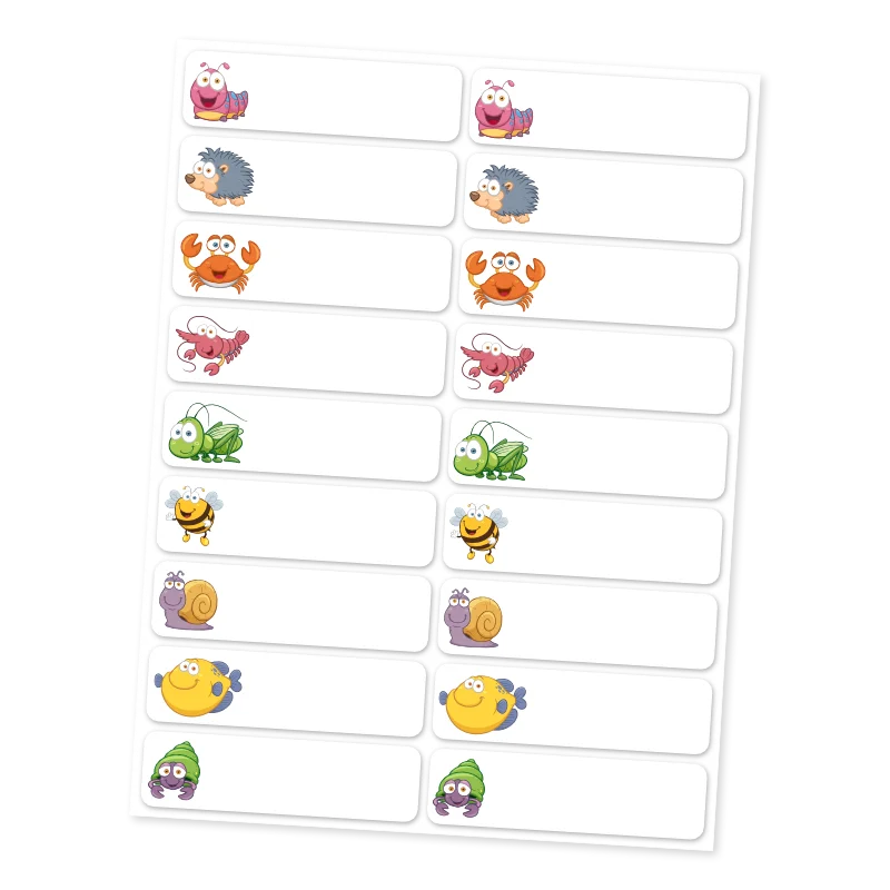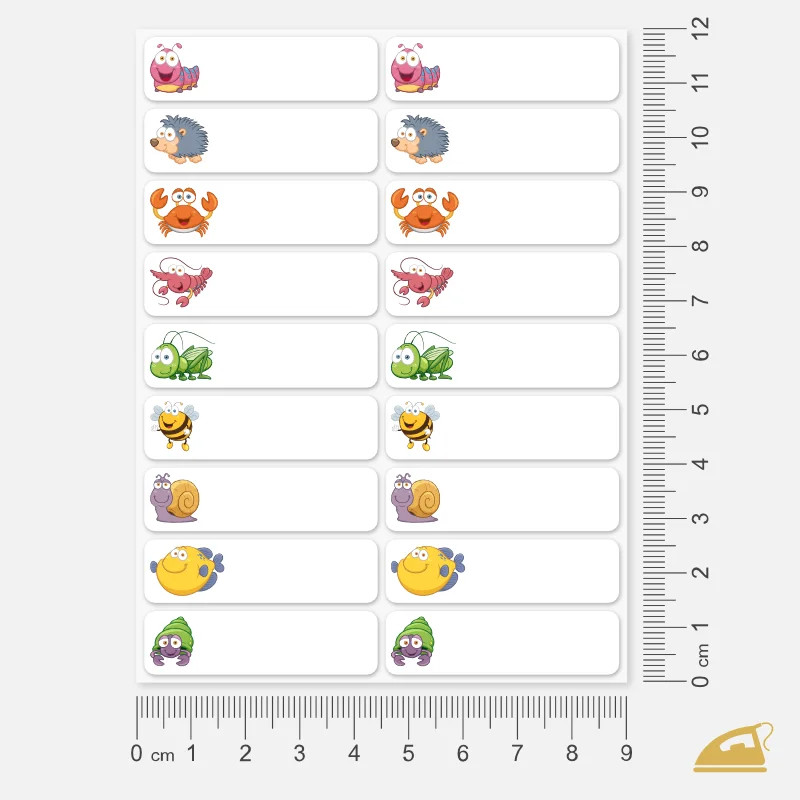 Nažehlovací popisovatelné jmenovky s veselými obrázky malých zvířátek pro snadné rozlišení a proti ztrátě dětského oblečení.