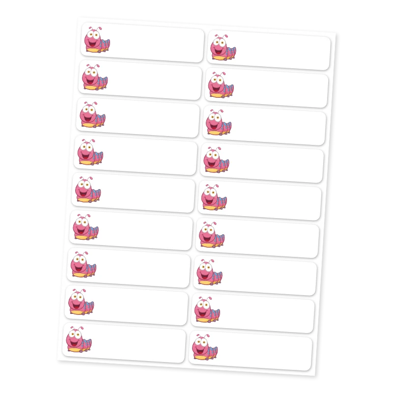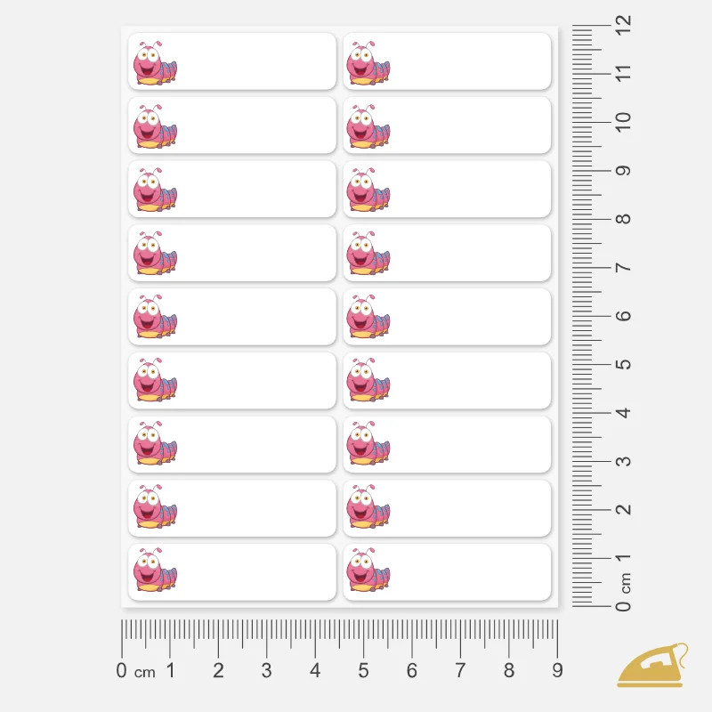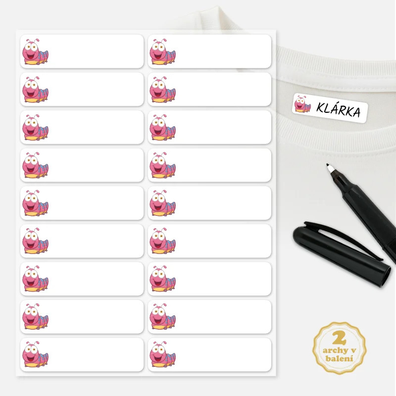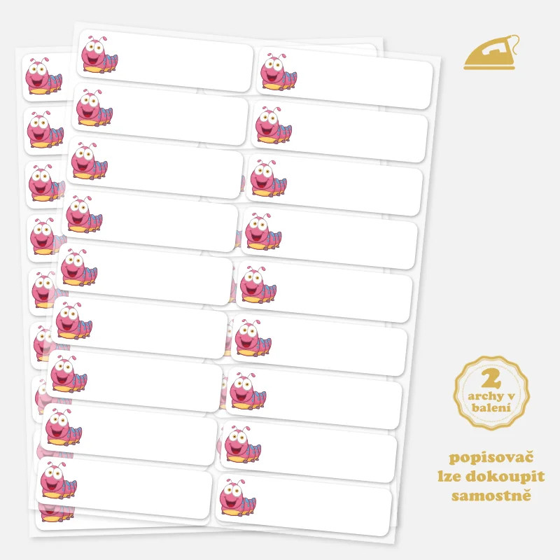 Nažehlovací jmenovky s veselou housenkou pomohou snadno označit dětské oblečení doma, ve školce i na výletech.