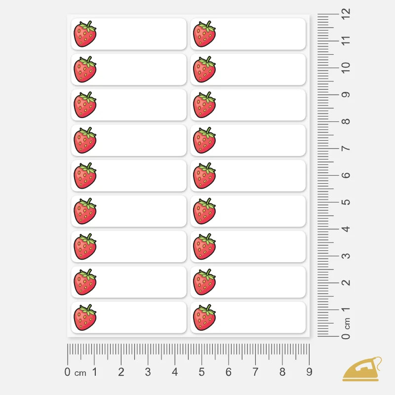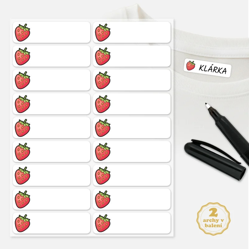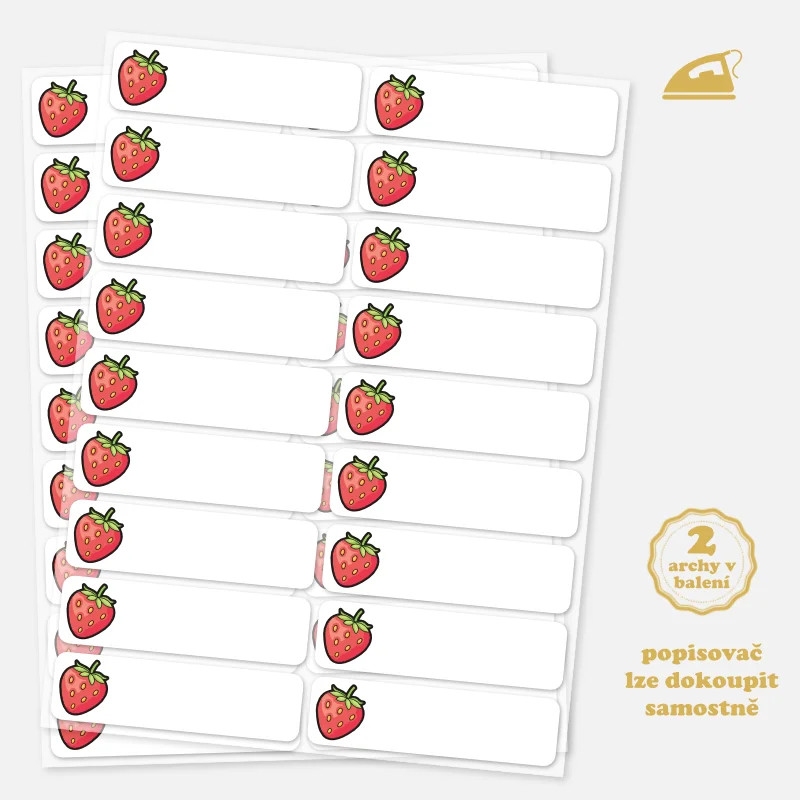 Nažehlovací popisovatelné jmenovky s obrázkem jahody pomohou holčičkám snadno poznat své oblečení ve školce i v dětských skupinách.