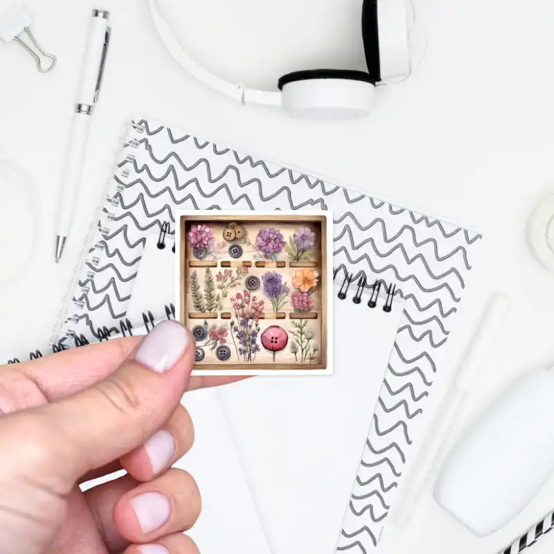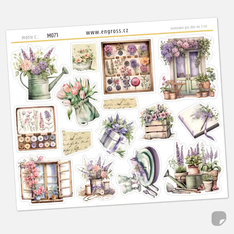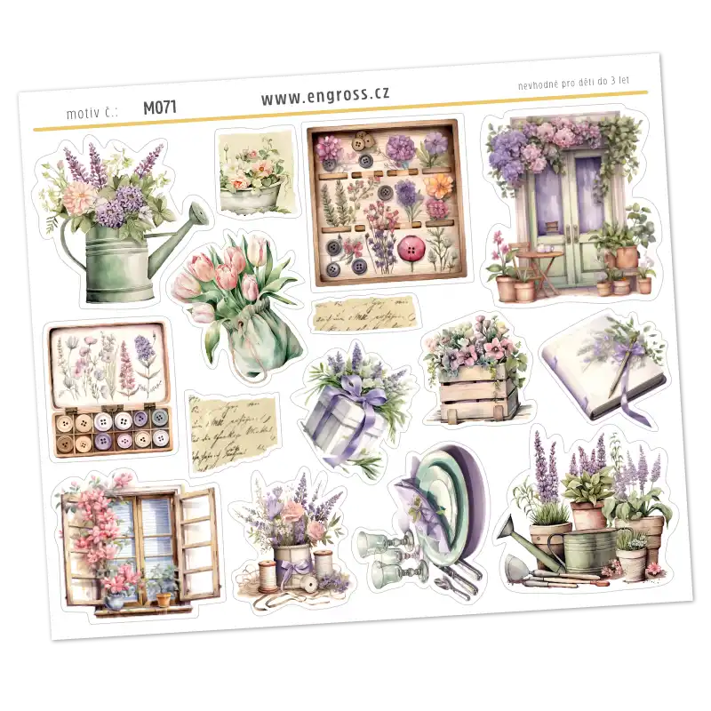 Aršík středně velkých dekoračních samolepek z kolekce Vistárie inspirovaný herbářem a jarním aranžováním. Vintage ilustrace krabic s knoflíky, dárkových balíčků, kytic a oken v růžových a fialových tónech jsou ideální pro kreativní scrapbooking i každodenní plánování.