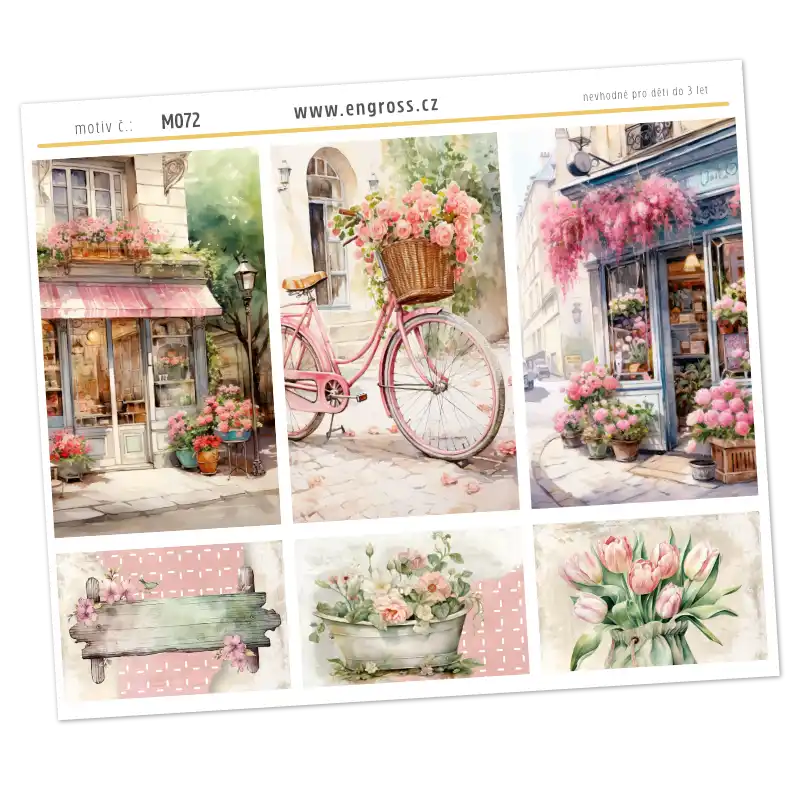 Tři velké vertikální boxy: Detailní pohled na vintage květinářství s markýzou, růžové retro kolo s košíkem plným květů a výlohu obchodu obklopenou záplavou růží.
