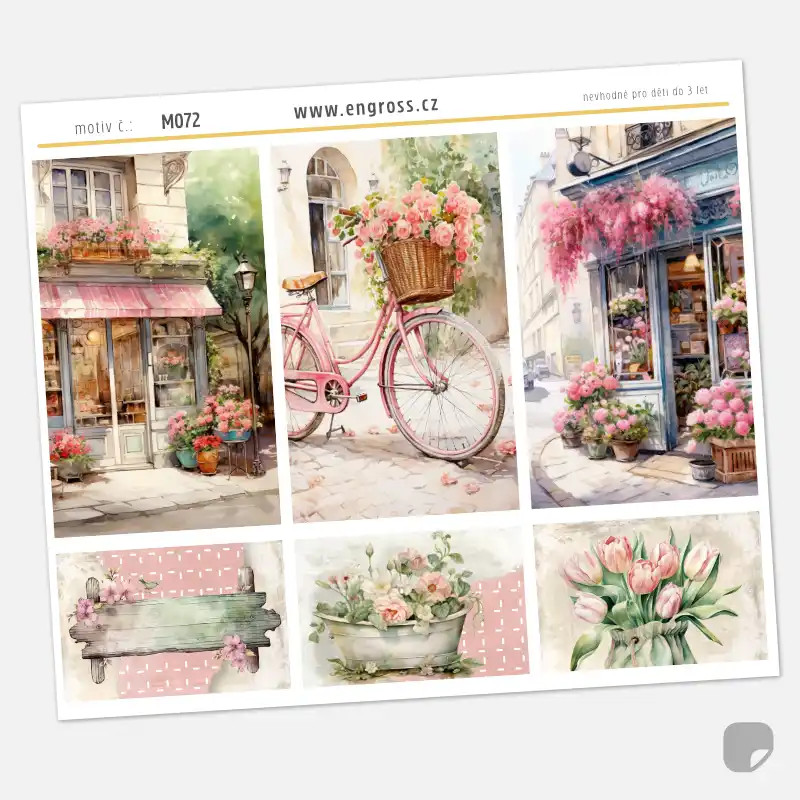 Sada velkých dekoračních samolepek (boxů) z kolekce Vistárie v romantickém vintage stylu. Aršík obsahuje detailní ilustrace růžových kol, květinářství a kytic, které jsou díky své velikosti ideální pro zdobení týdenních přehledů ve větších diářích nebo pro scrapbooking.