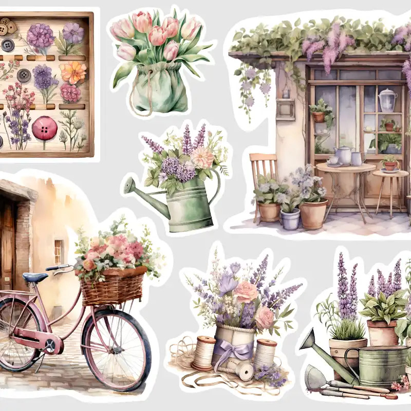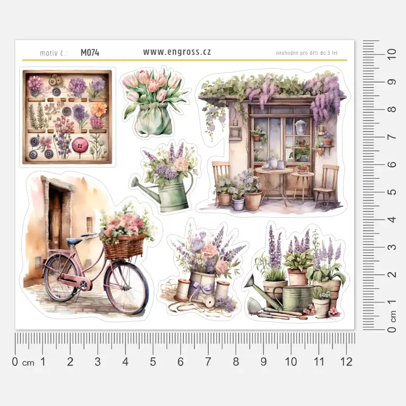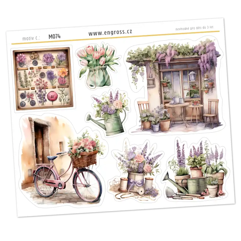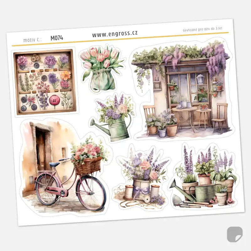Aršík velkých dekoračních samolepek s motivy jarního zahradního zátiší. Akvarelové ilustrace konviček, proutěných košů a květin v romantickém vintage stylu jsou díky své velikosti perfektní pro zdobení měsíčních přehledů, úvodních stran nebo scrapbookových koláží.