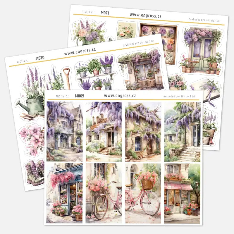 Aršík z kolekce Vistárie přináší do vašeho plánování klid a estetiku venkovského sídla. Tento aršík se soustředí na větší, detailně propracované motivy, které vyniknou zejména v rozměrově větších diářích nebo na úvodních stranách měsíce v bullet journalu. Barevná paleta postavená na kombinaci fialové, tlumené zelené a krémově béžové působí velmi harmonicky a dospěle.