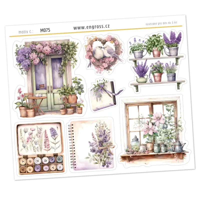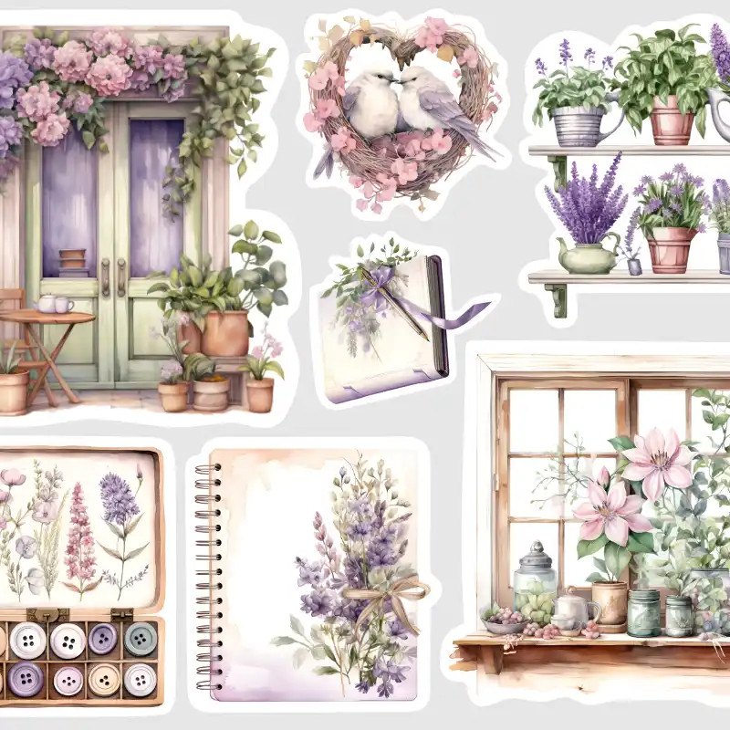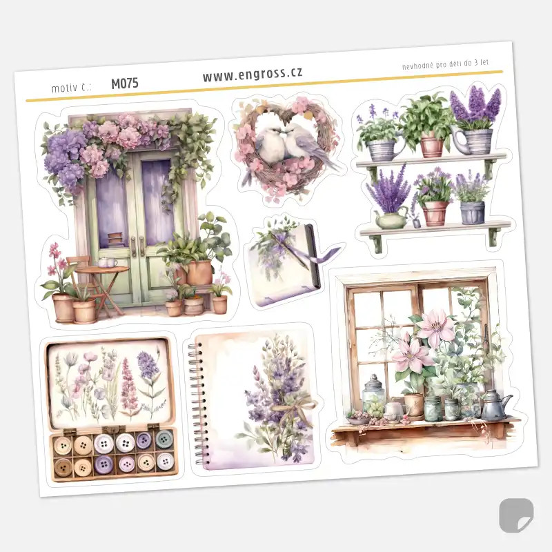 Sada velkých dekoračních samolepek z kolekce Vistárie s motivy zahradničení. Romantické akvarelové ilustrace květin a kvetoucích domů v zelených, fialových a béžových tónech jsou ideální pro zdobení velkých diářů a scrapbooků.
